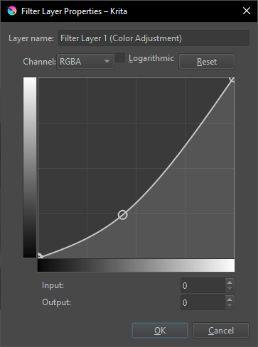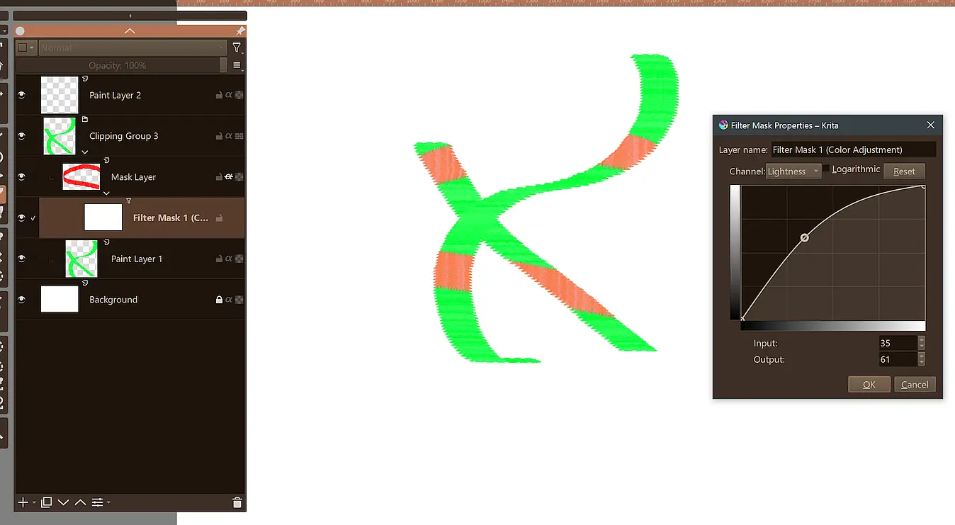 ==> Now, the important thing: click on the “Create Filter Mask” button, not on “OK”! Because that way Krita will create a mask and you can go back to the filter dialog box if you need to redo the adjustments. To do this, just go to the layers docker, right-click on the filter mask (1) and choose the first option, "Properties": the dialog box will appear again. You redo the adjustments (a and b) and click OK (c) when you’re done.