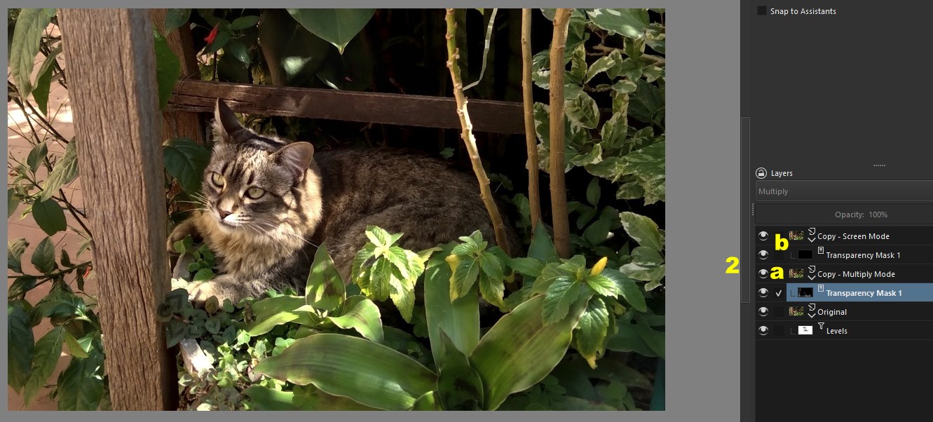 I took the opportunity to test what I said before: I created two copies of the Original layer, deleted their filter masks and, in their place, put transparency masks painted entirely with black (2). I changed the mode of one of them to “Multiply” (a) and the other to “Screen” (b).