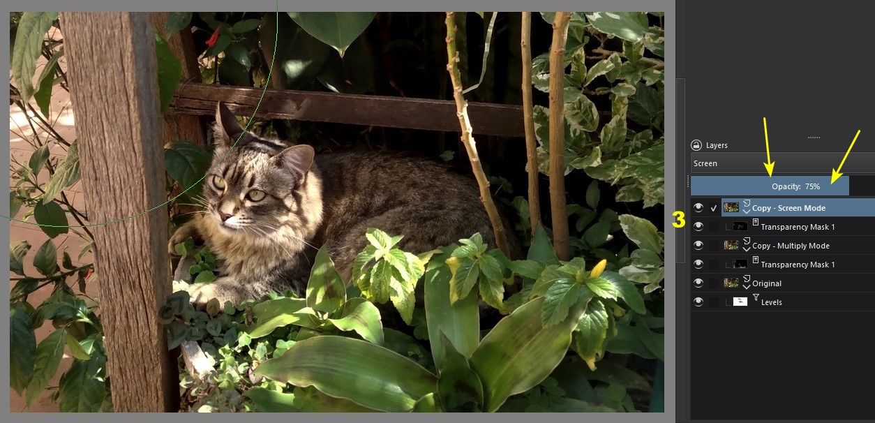 Finally, I edited the mask of the “Screen” layer (3): I mainly retouched the cat’s body, in order to make it stand out more. As my retouching was a little more than ideal, I reduced the layer opacity to 75% in order to solve the problem: