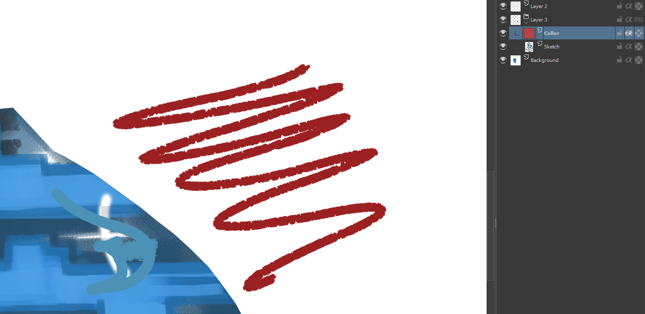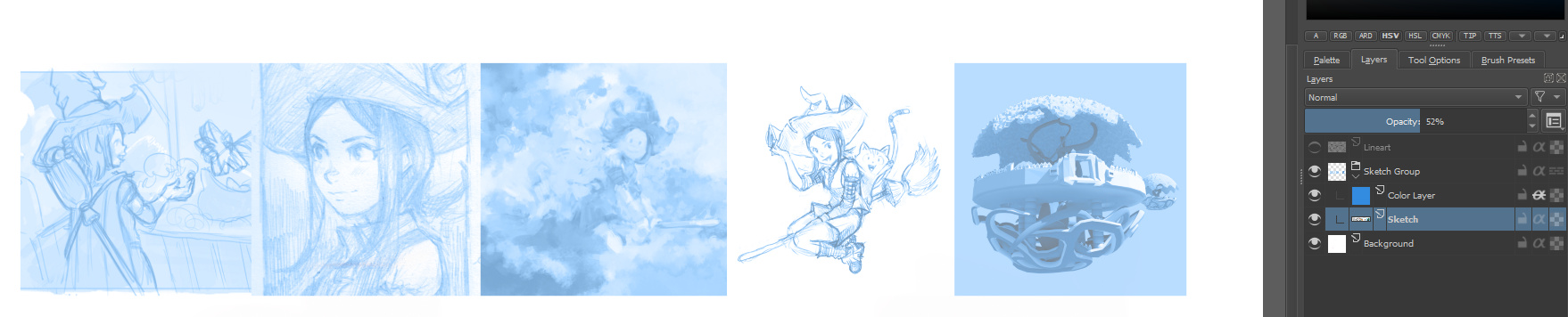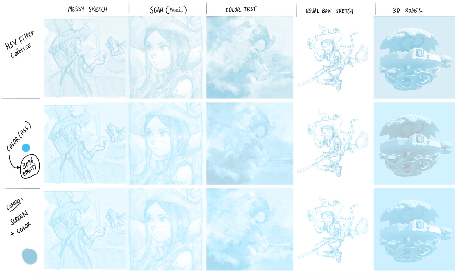 Screen paint-layer(my fav): Adding a paint layer between the sketch and inking with the blending mode “screen” filled with bright blue.