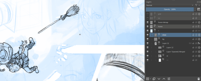 It’s also super convenient to use the same inking tool (a black solid line, or dark grey textured pencil) and use it while inking to bring modification to the sketch layer in blue without having to switch drawing color or switch brush presets. (eg. adapting quickly the position of a hand, a arm while inking because the sketch wasn’t precise enough), with this layer in blue you just need to switch layer.