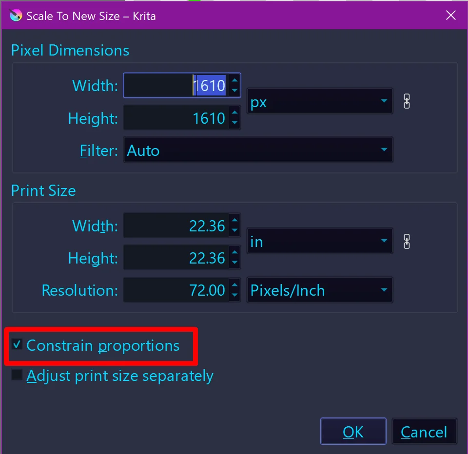 Where you can instruct Krita to maintain the aspect ratio (Constrain Proportions):