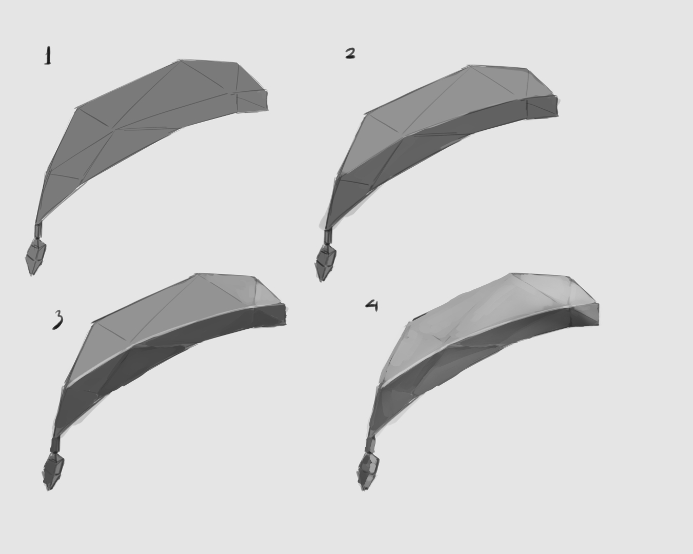 There’s also rule of contrast to be kept in mind, which is if something is brighter then planes on the opposite site should be darker. I called this Flashlight contrast rule since the example is when you shine a flash light, objects Inside the beam will get brighter, but object Outside the beam will get darker.