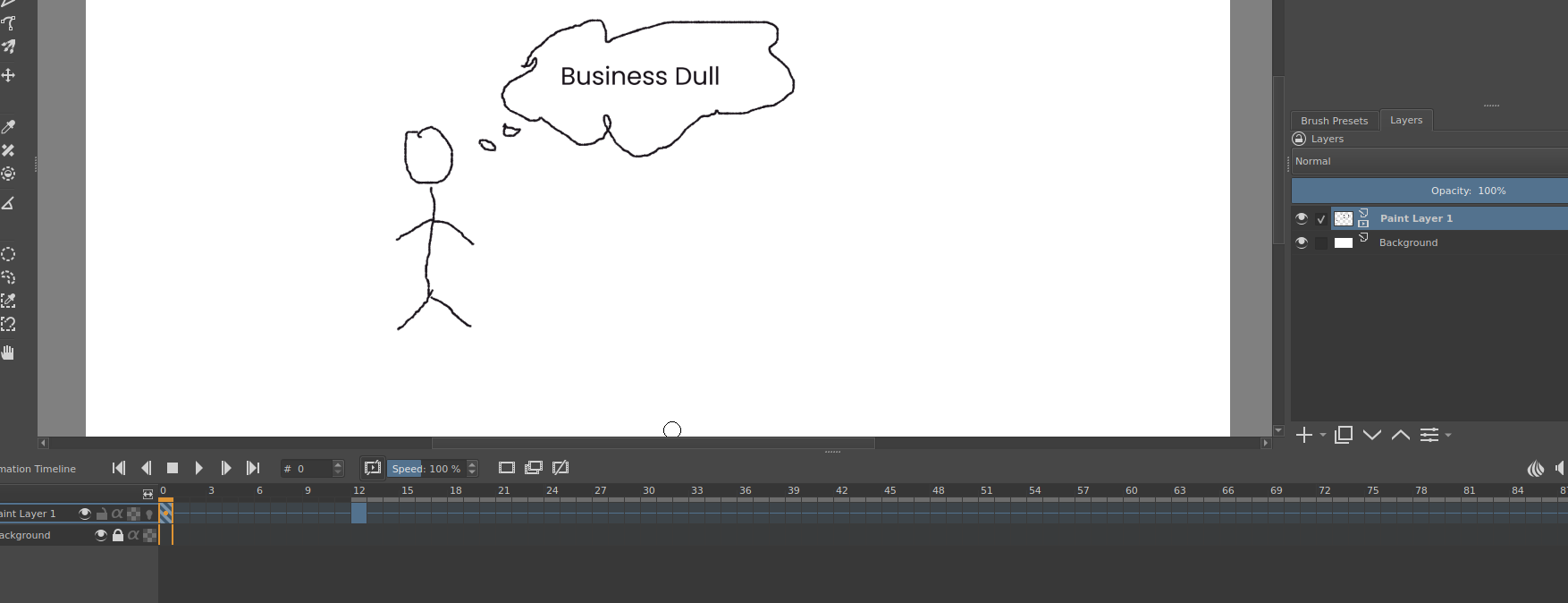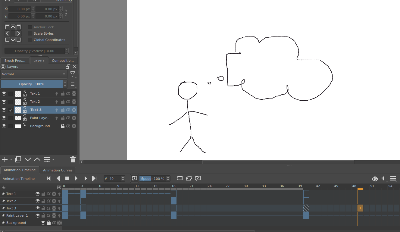 It would be better to have Text-1 and Text-2 in their own separate paint layers then animate them using right-click → Create Duplicate Frame on their timeline at frame-0 and moving Text-1 to frame-12.