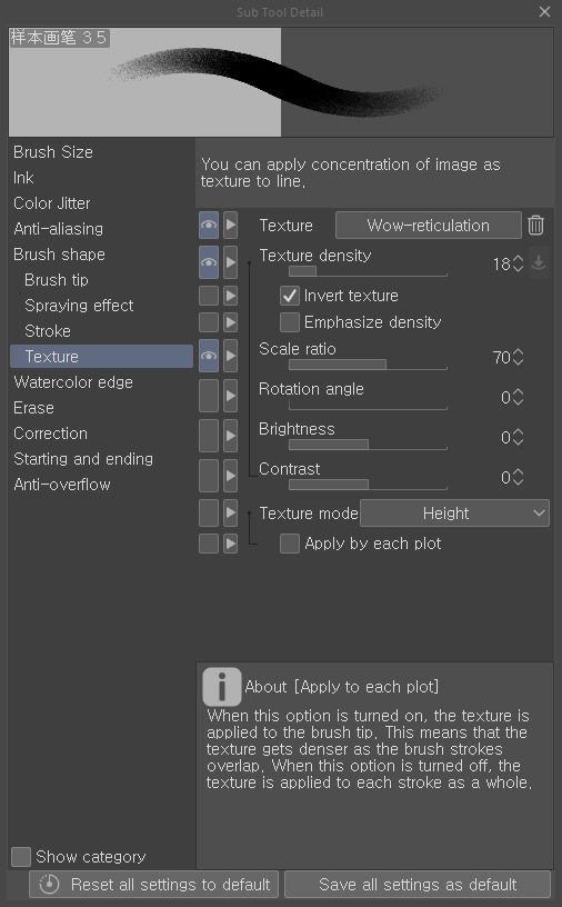 And I was able to reproduce the same texture behaviour to Krita in CSP by using Height + Texture Per Tips(done by checking âApply by each plotâ in CSP)
