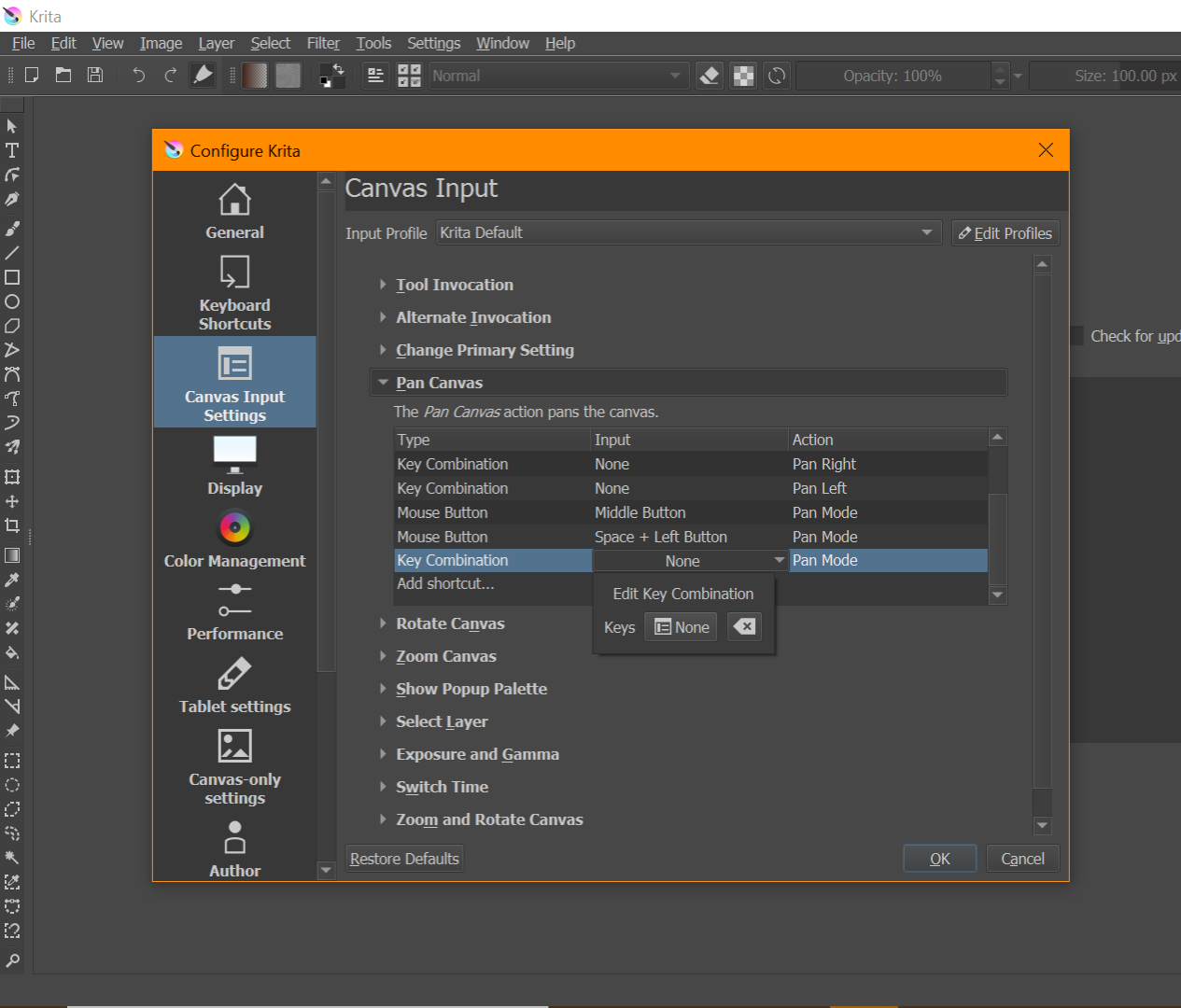 The Canvas Input Settings will respond to key combination, mouse button or mouse wheel signals. That is selected under ‘Type’ when you create or modify a shortcut.