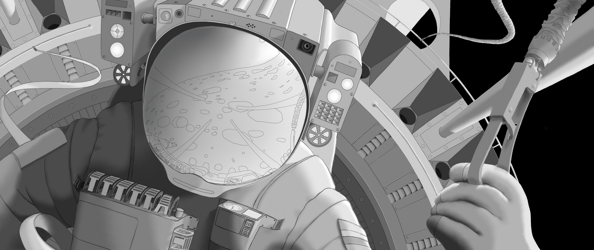 I take ten shades from white to black and start applying light and dark based on the direction of the main source, which is slightly above the center and slightly behind the astronaut. Then, once I understand where the light and dark areas are, I add gray shades for the mid-tone.