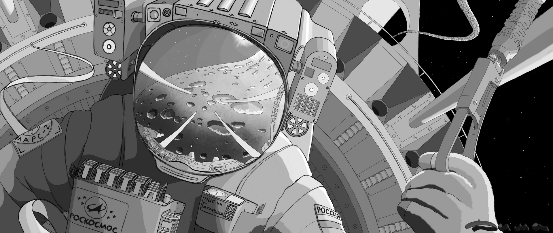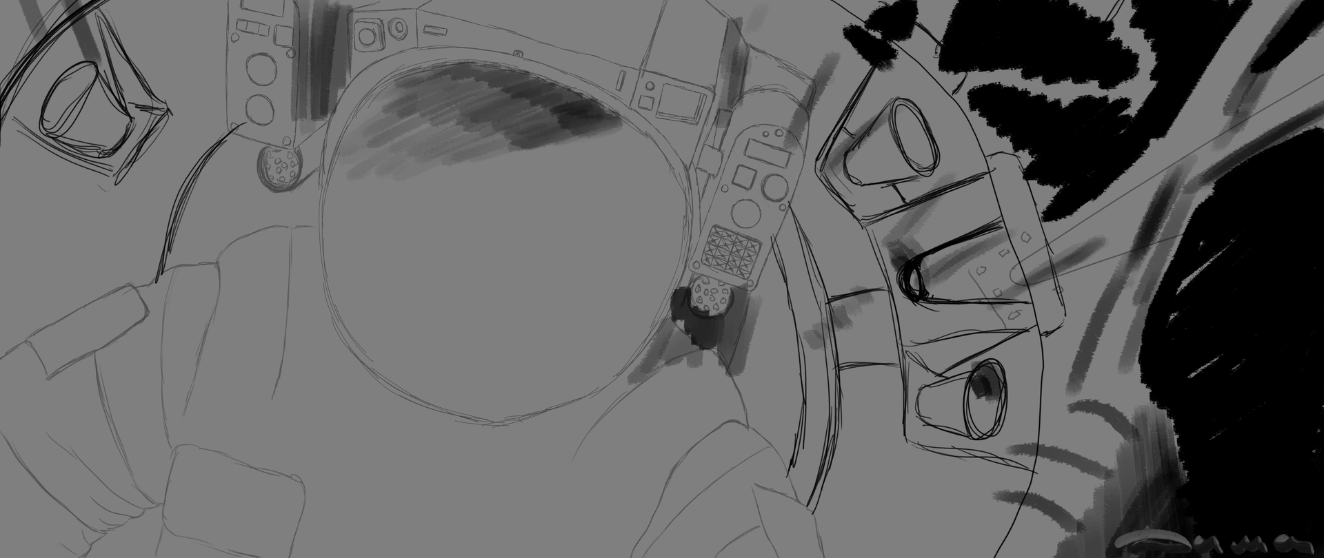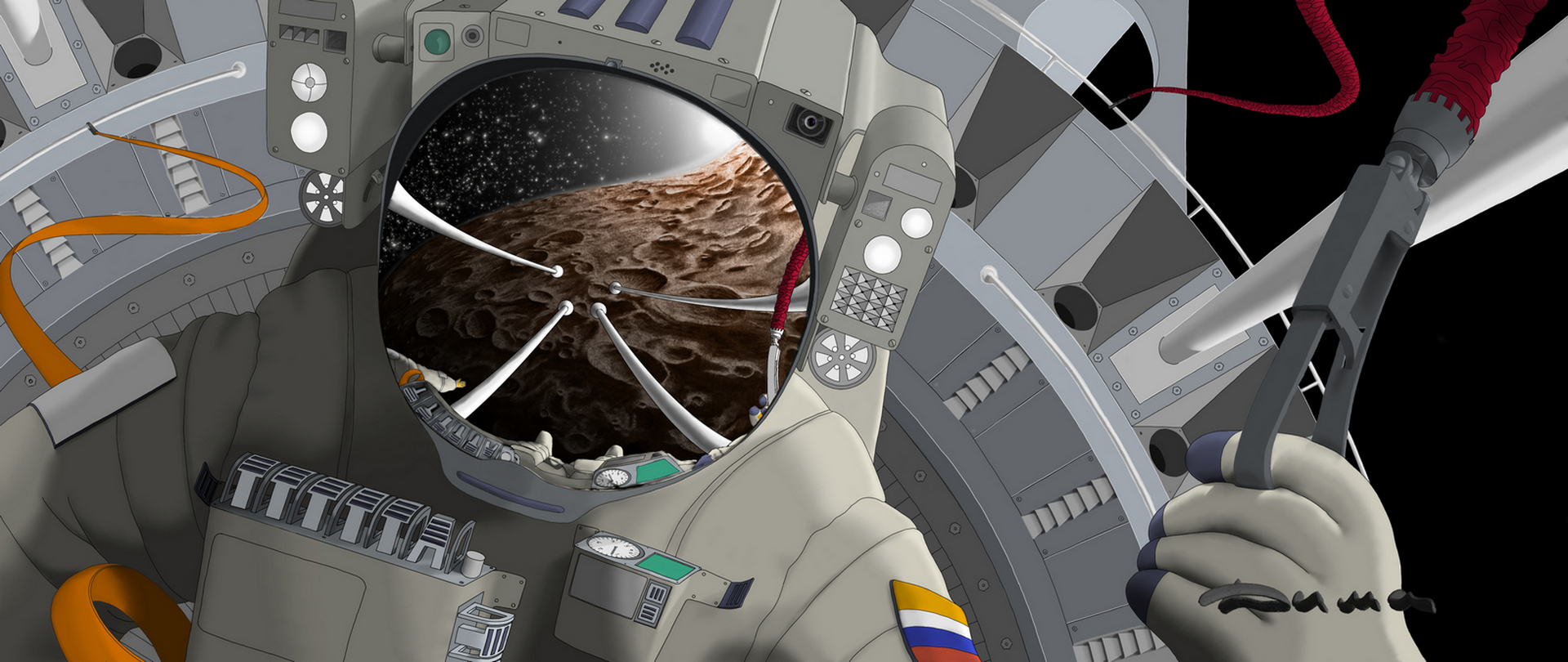 Для сюжета моей книги, получился слишком стерильный. И я добавил разных текстур, измазал технической грязью скафандр и придал кораблю немного потрепанный вид, результат на основном рисунке.