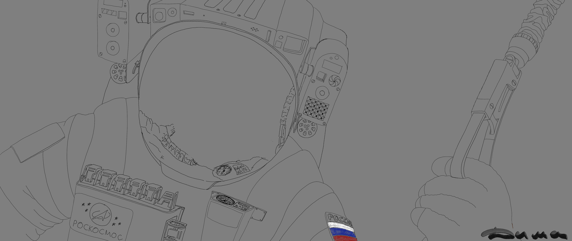 Беру десять оттенков от белого до чёрного и начинаю наносить светлое и тёмное исходя из направления основного источника, от вас он с права немного выше центральной части и совсем немного позади по отношению к космонавту. Потом уже поняв где темно где светло накидываю серыми оттенками полутени.