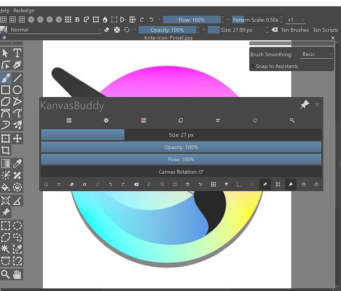 Kanvasbuddy is very nice and uses the very same panels as in my workspace, but the window is too small for my taste. Pity it cannot be resized. Maybe I’ll give Kb another go. And, Kanvasbuddy was designed for fullscreen mode, imo.
