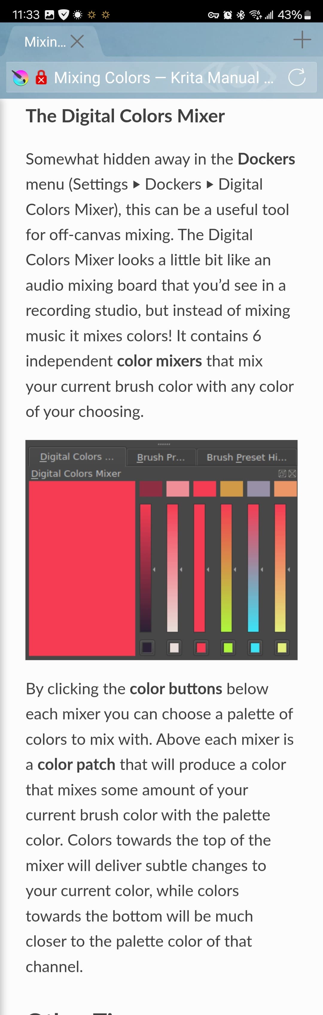 I use it frequently and when I want to mix a color that I’ve used in my painting, I just select the color (using the color picker) then tweak it by using the digital color mixer. With that, I can add colors that are not near each other in the traditional style color mixer and therefore get the color that I had in mind. It’s rather fun to play/experiment with.