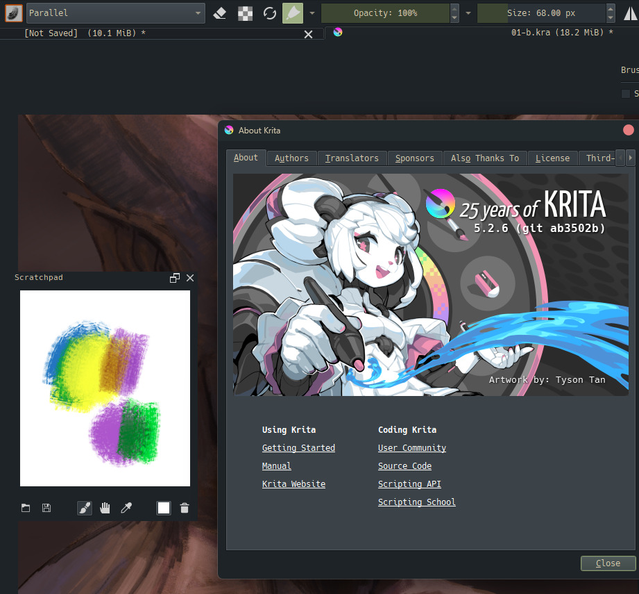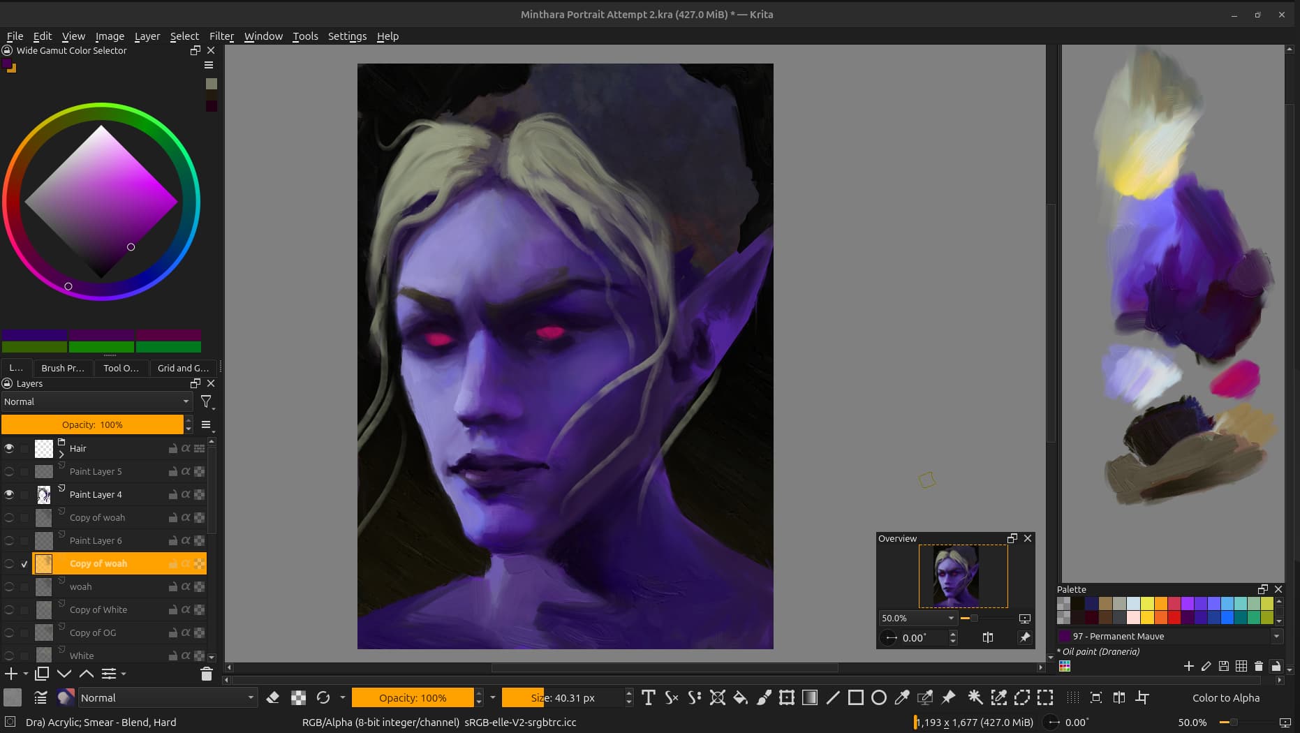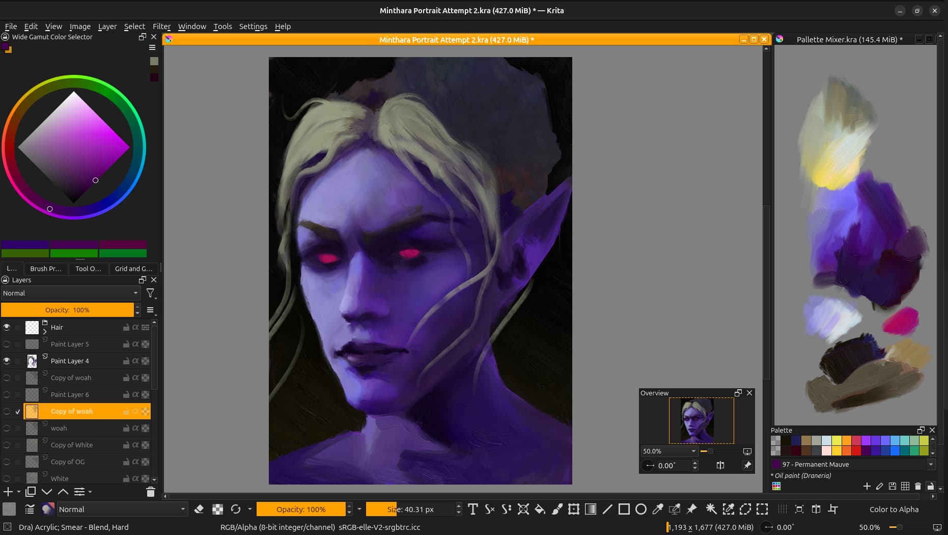 Constrained to paint mixing capabilities of the software! I recently read “spectral blending mode” and I can’t wait for that tech to make it’s way into Krita. Using “parallel” you can mix greens easily, but colours tend to wash out and you can let go of any dreams of mixing red + blue to make a bright purple xD