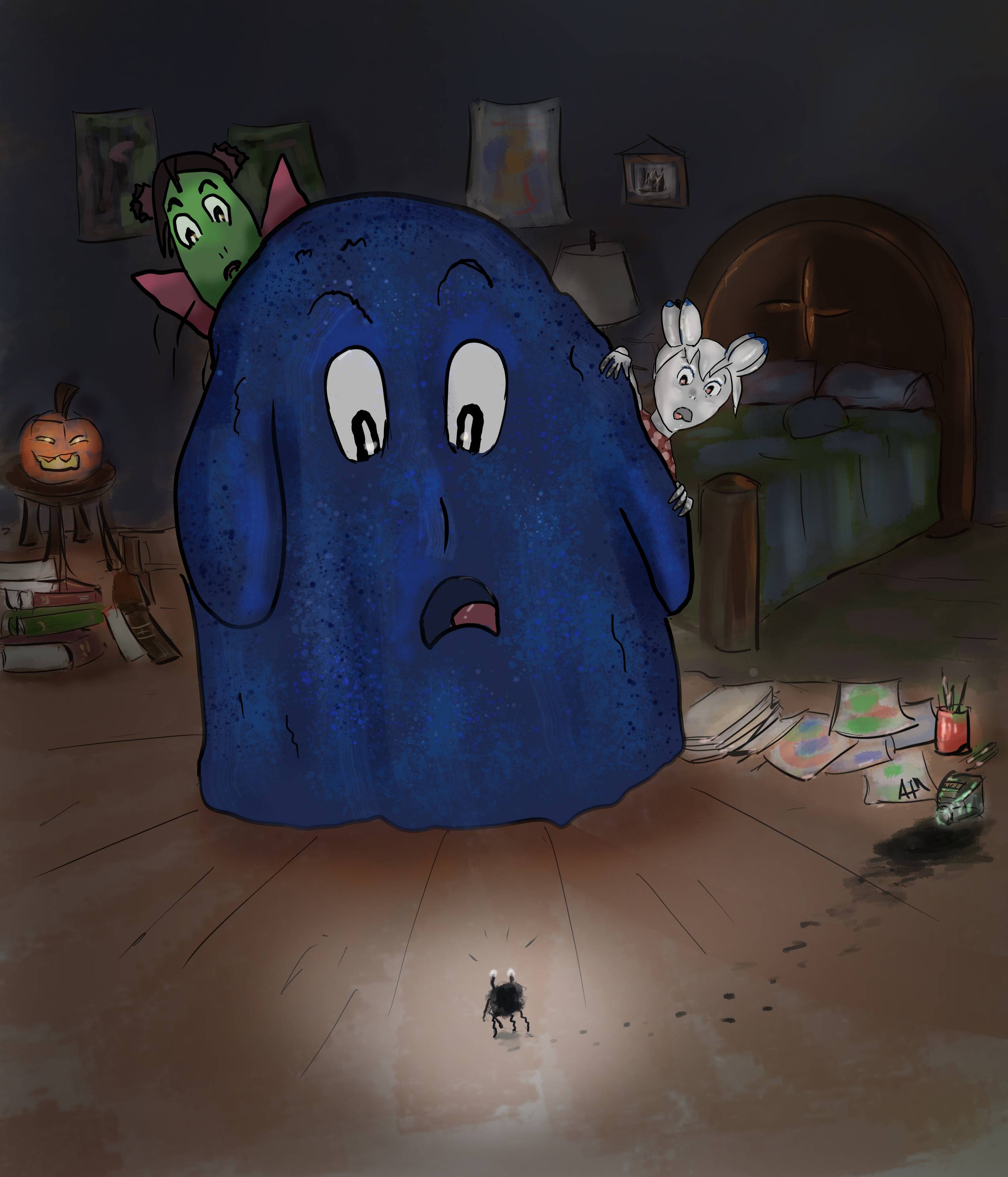 I thought, wouldn’t it be fun if Kiki had some Monster Inc-like friends, but were afraid of a dust bunny? (Although the thing is the size of a mouse; I don’t blame her). It all morphed into a Halloween theme somehow. Enjoy!