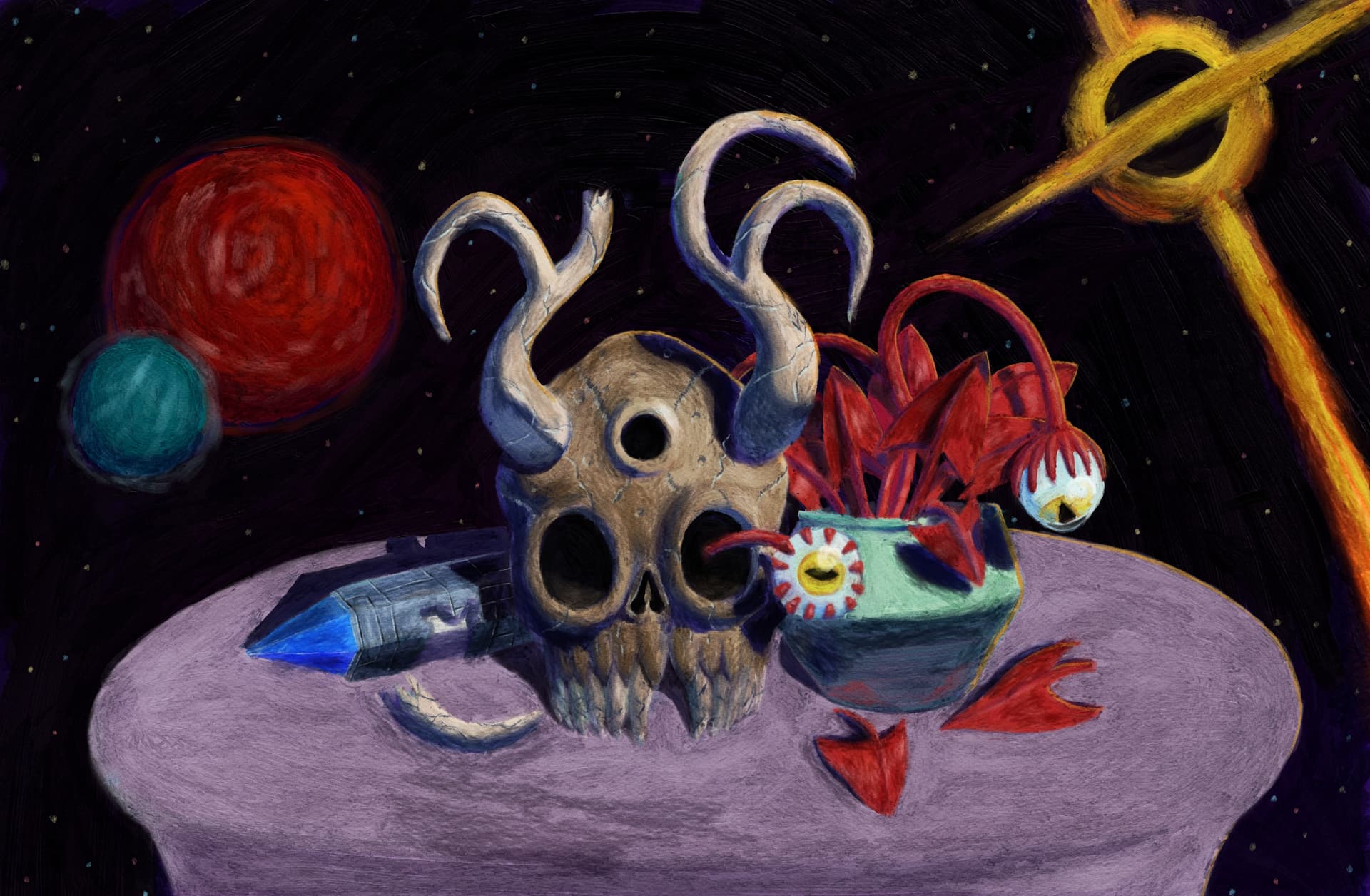 I made this fantasy vanitas inspired painting about a knight coming home after a battle and relaxing while surrounded by his spoils.