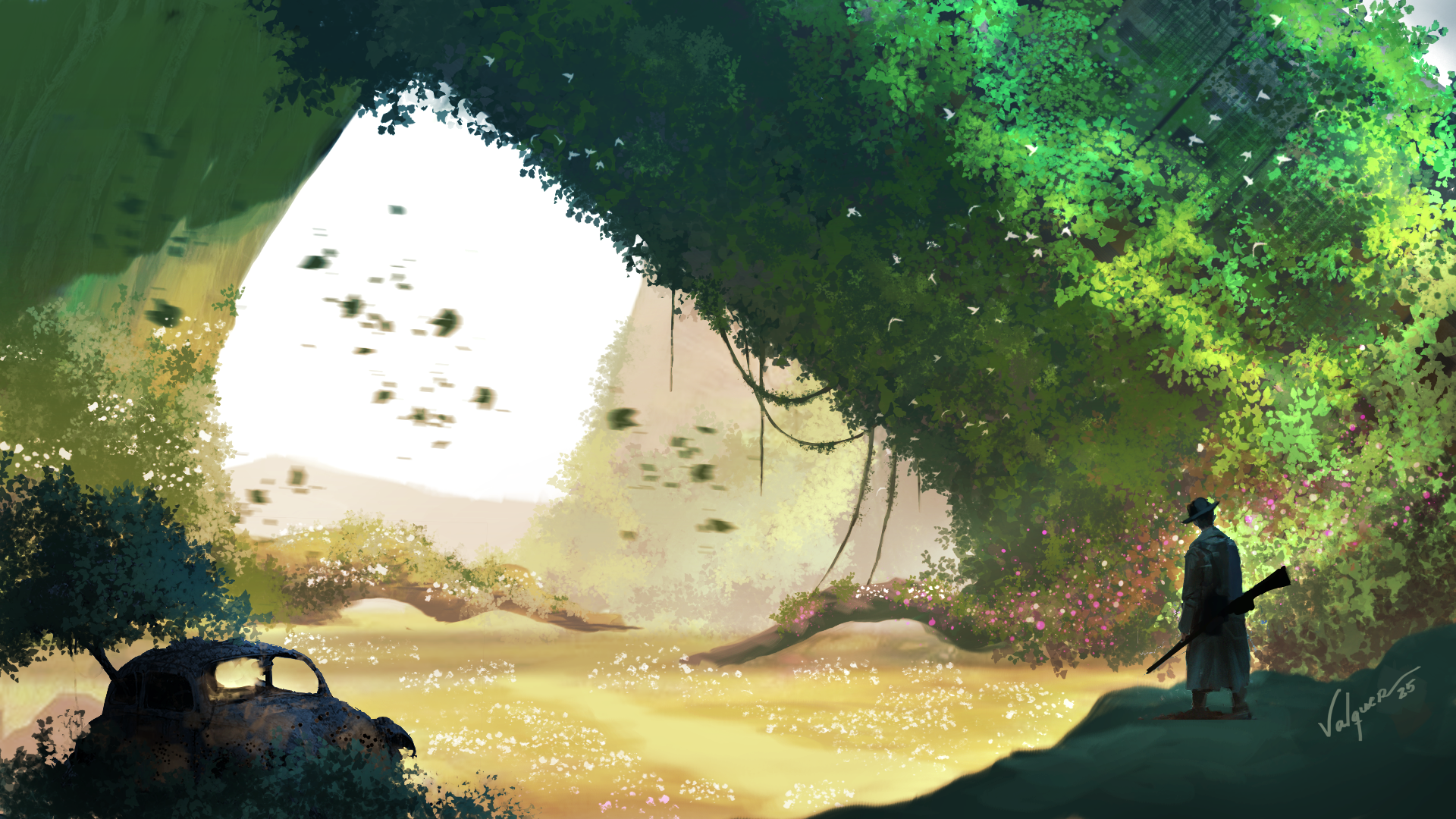 Imagine a city abandoned for thousands of years. Human civilization has vanished, and the Earth is finally reclaiming what is its own. I aimed to capture an atmosphere of melancholy, hope, and contemplation—where the light breaks through the foliage to illuminate a rebirth, and human artifacts (like the abandoned car in the foreground) are merely transient symbols of our brief passage.