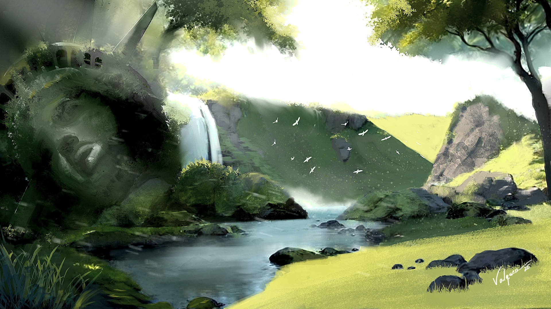 This piece portrays a quiet, distant future where nature has reclaimed what once belonged to civilization. The Statue of Liberty, now weathered and partly overtaken by vegetation, stands as a silent reminder of a world that has passed. The river, light, and open landscape suggest renewal and peace, contrasting with the monument’s decay. My intention was to blend nostalgia with hope, using a calm palette and traditional-inspired brushwork to create a sense of timelessness.