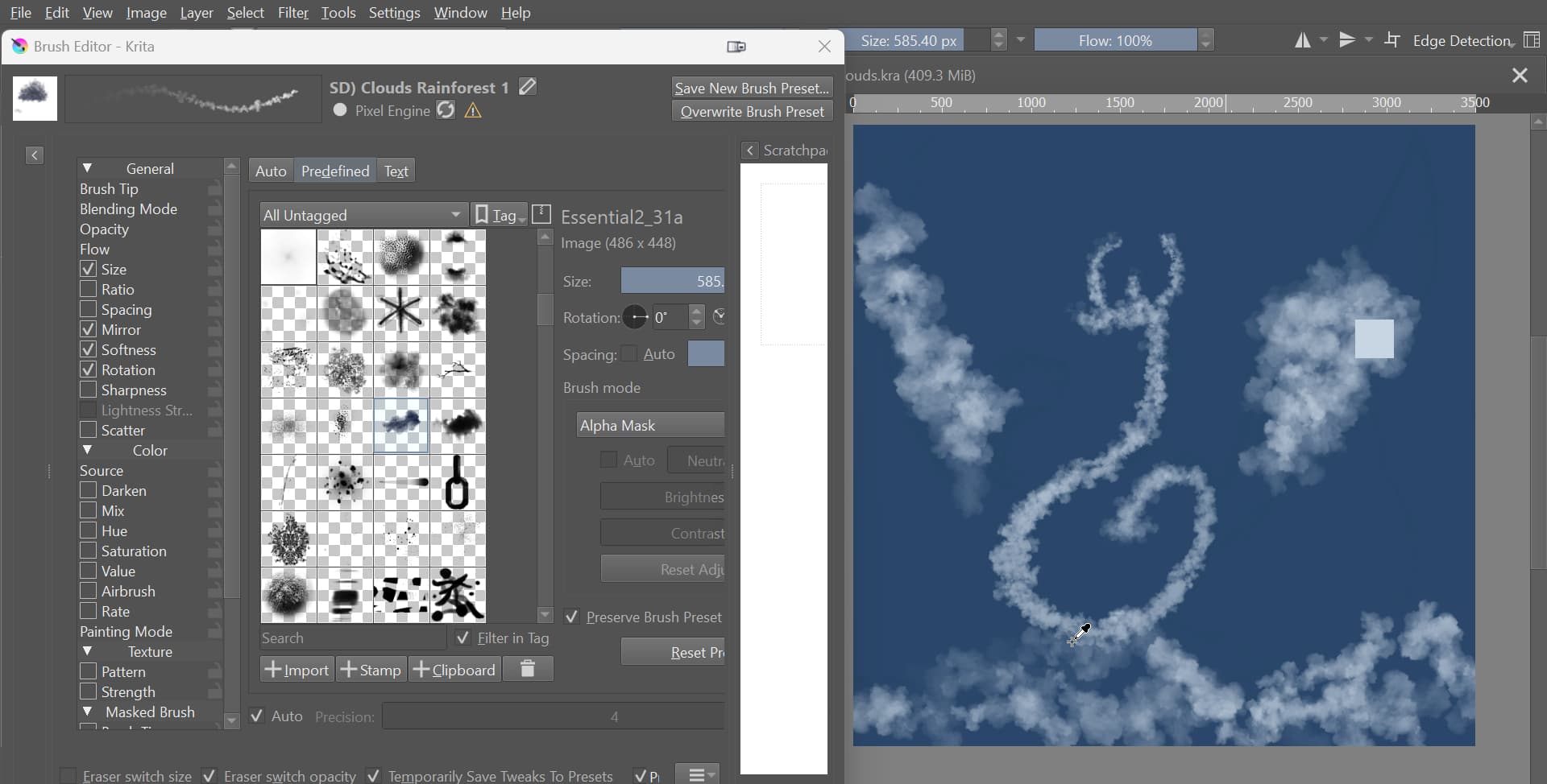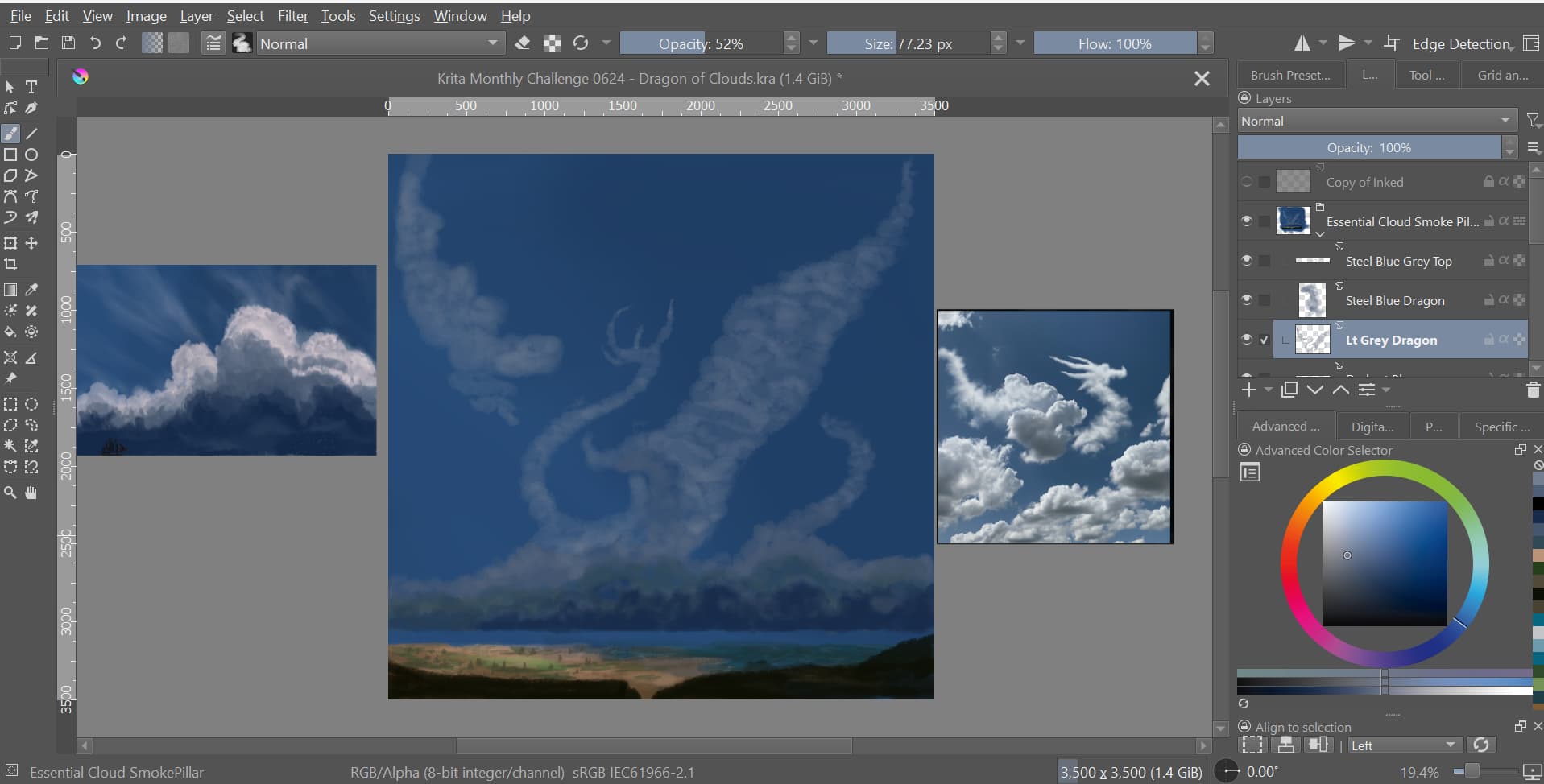 Had to switch brushes and start over, the land was just not working with the custom brush I was using. Now I’m using the Essential Cloud SmokePillar for everything and I think it’s starting to come together. Now I’ll just need to work on adding in the cloud dragon highlighting to give it some more personality…