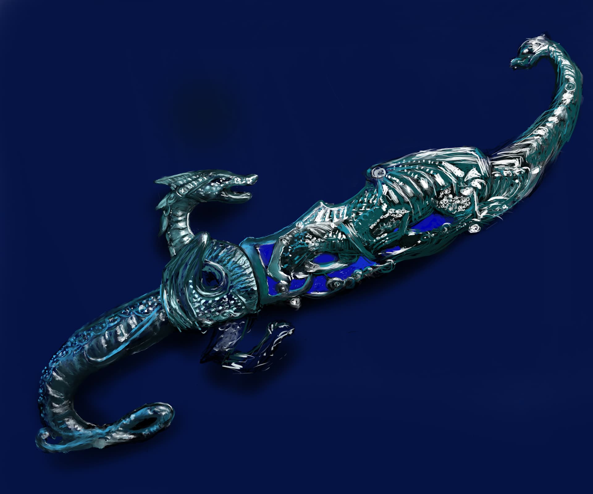 I usually do landscapes so there’s not a whole bunch of metallic stuff in my works. The background is nowhere near set, I’m not even sure if it’s going to be a waterfall, trees, or something else. I just wanted to block something in and see how it all fits together. However, even in this beginning of a setting, the monolith seems to be just sitting there, not as majestic as I’d like it to be. I tried to capture the gleam of the monolith and make it even more than what’s in the references. I’m totally up for pointers on how to make it look more… I don’t know… shiny?