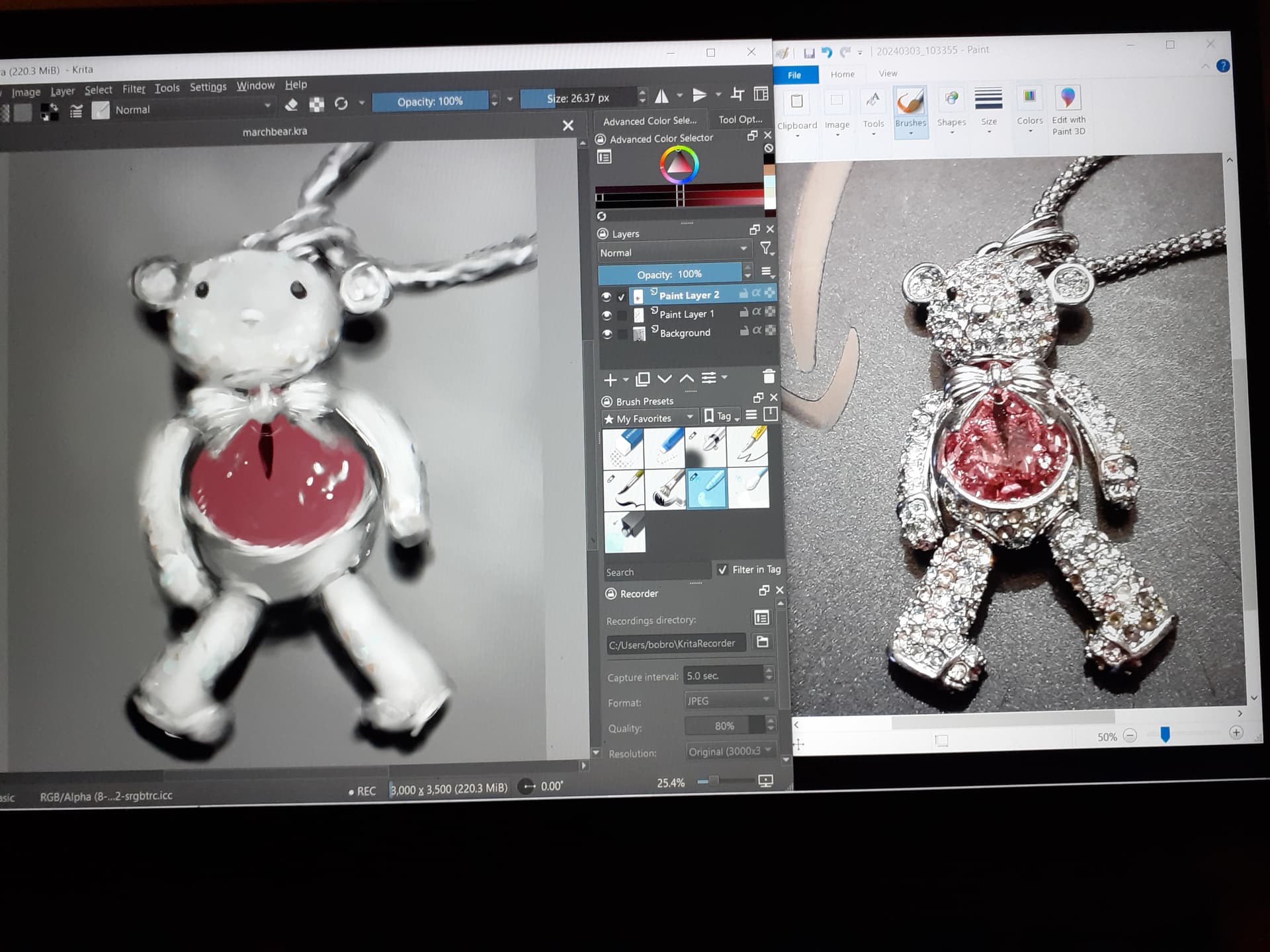 WIP. Rhinestone and silver bear necklace with metal clasps. It will be all hand drawn with my usual 2 or 3 brushes,ink pen, blender, airbrush, lasso tool, and 3 layers. No tracing and though Ill try to get the image as accurate as possible I may add some creative flair. I’ll try to post a video or at least some step by step progress images.