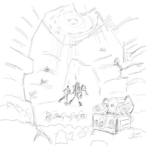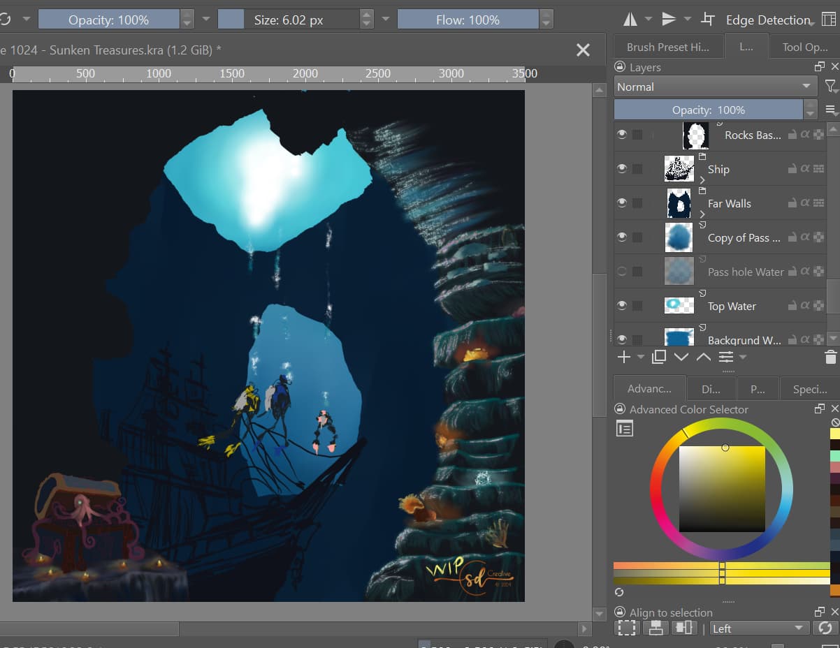 My first thought was to do an underwater vista with a dark cave, sunlight streaming in from above, bright plants & fish, and scuba divers who have swam right past a sunken treasure. The fish near the surface will subtly bring in the spirals and once I added the octopus over the treasure there were more opportunities for those with the arms (legs?).