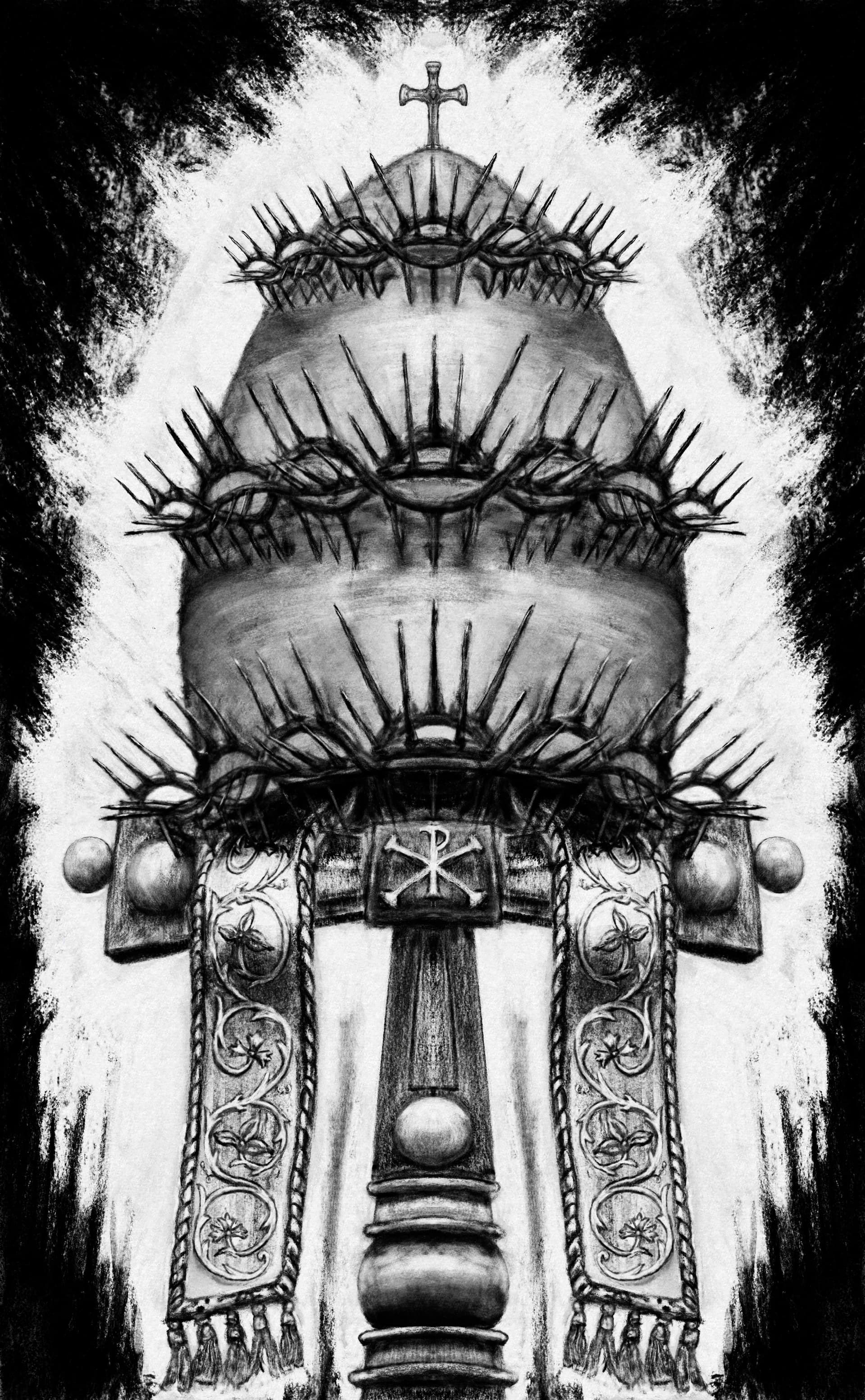 It is what this challenge is about. Back in April I decided to use the conclave as a pretext to design a tiara whose thorns would force the wearer to constantly hold his head upright to avoid being pricked. Unfortunately, I was too late to finish it before pope Leo XIV was elected, partly due to my other activities, and I also fell ill(as I often do during the transition from colder to warmer seasons and vice versa). This one here really tired me out, even if I copied one crown of thorns and just changed its size, I was still struggling with each thorn and the the value range still didn’t suit me. When conclave was over, I didn’t feel like finishing the work, but I hoped to remake it someday. But this time with black and white paint, not charcoal.Unless I fall ill again, I’ll do so this month.