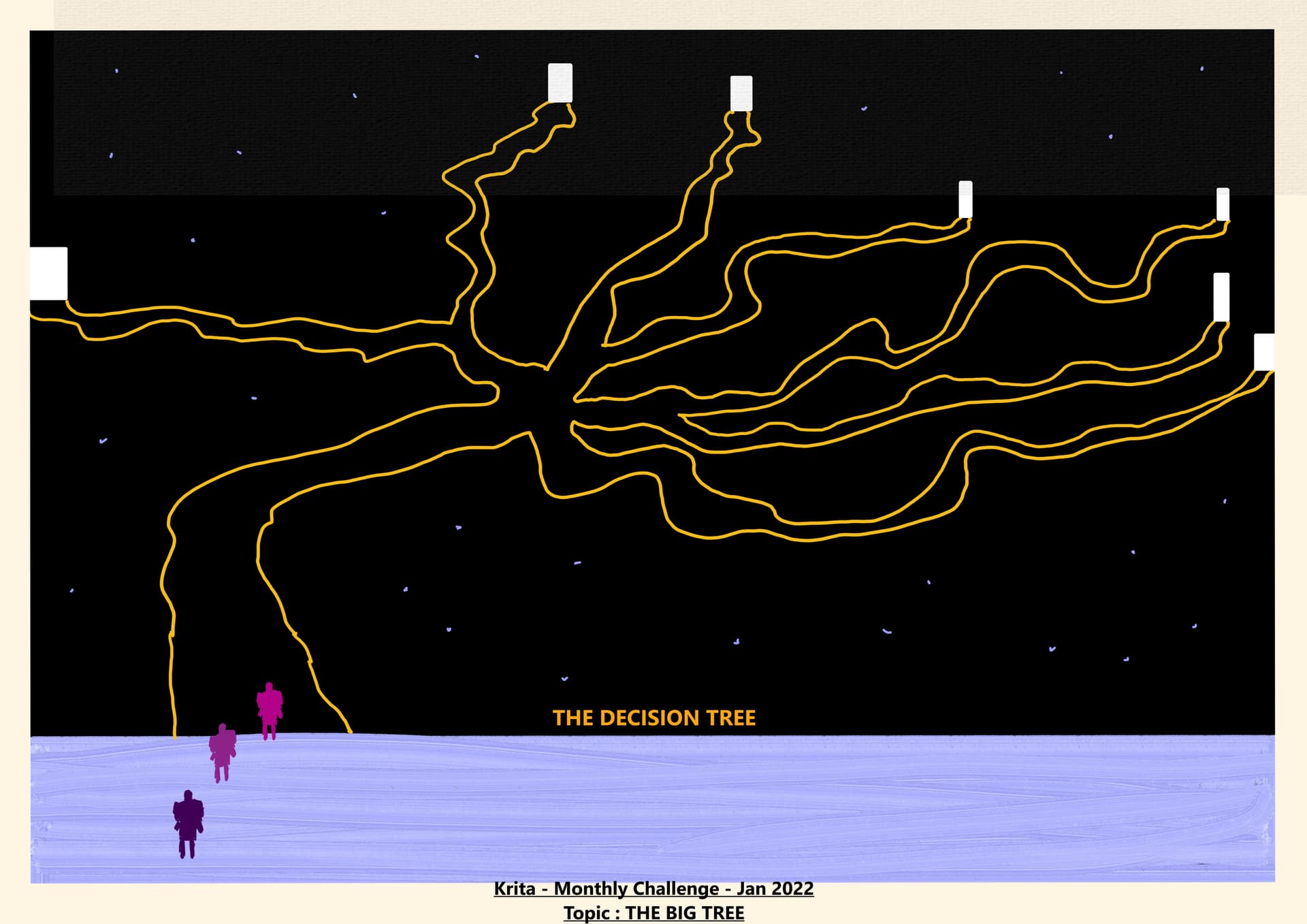 In fact, this is my first digital painting without any preliminary traditional drawing (and it’s a long time I play with Clip Studio Paint and SAI2). Well, it’s inspired by an old drawing I made some years ago but I recreated it in Krita without scanning or drawing. I hope you’ll like it. And now, let’s share it on the Web.