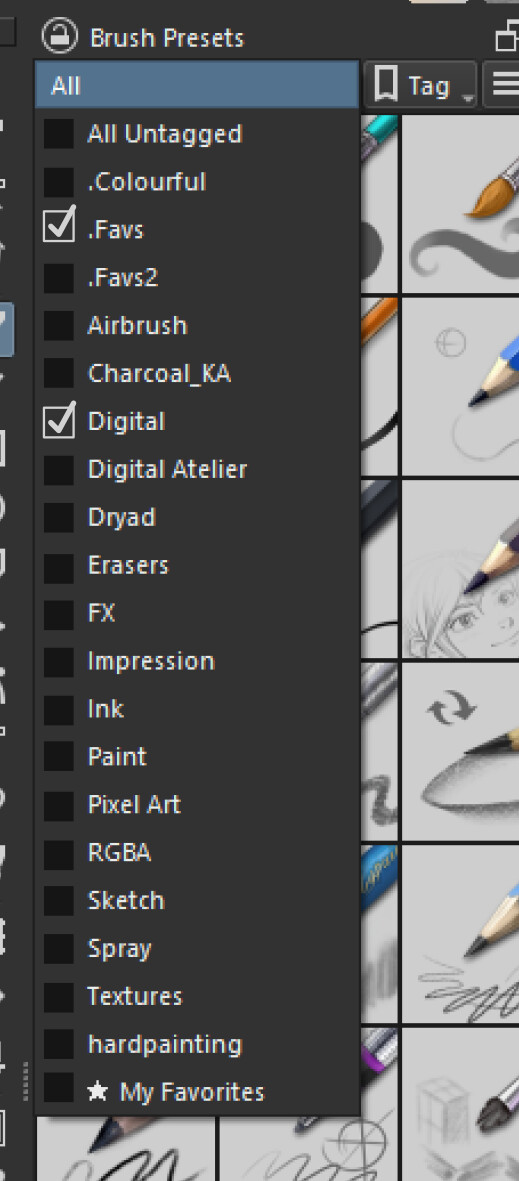 I want to be able to go to the Docker tab and bring in new windows of “Brush Presets” or do it from the existing docker window. As many as I want ideally. Then I would sort them in tags to have the brushes I care most about to be easier to access.