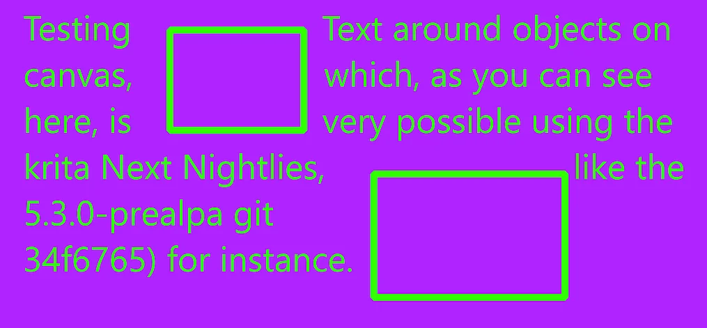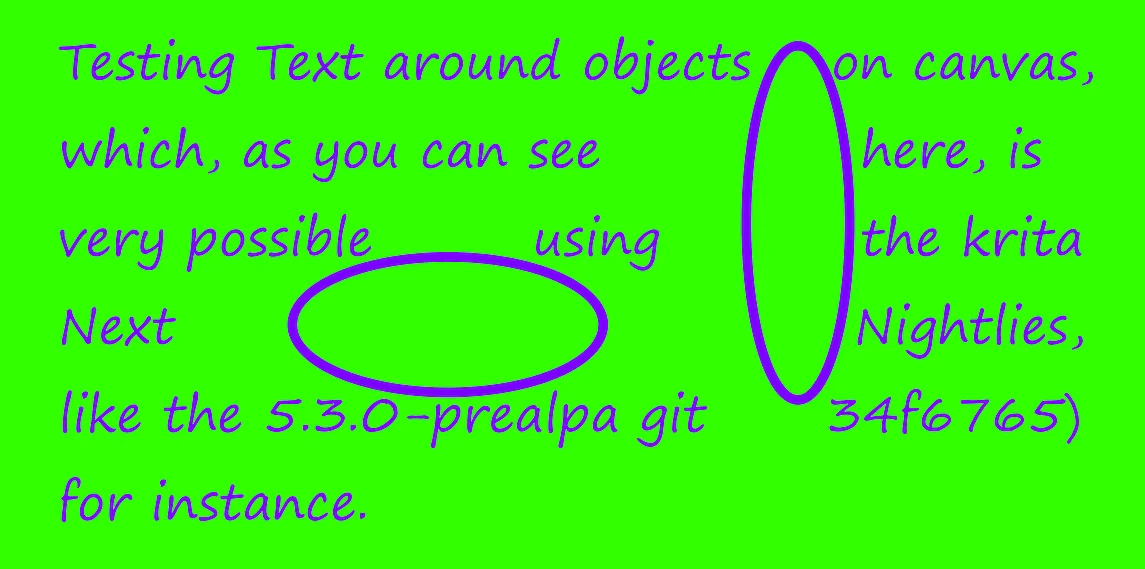 Additionally, there should come something that I know under the name “flow-text” or “floating-text” (translated from German, may be named differently in English), which will, when enabled, automatically draw your text around the objects on the layer you are on. I even saw a demonstration of it, but I’m currently not able to locate/identify where to enable it, and I can not say if it is already implemented or if that only was a demonstrator, but you should be able to find it in @wolthera’s Text Tool Thread.