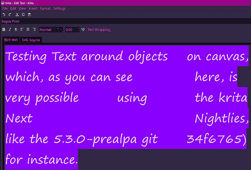 Get the current Krita Next nightlies, these allow on canvas text editing and that makes it easy to write around or even in objects on canvas. Here you can see how the first text looks in the editor after I wrote it on canvas: