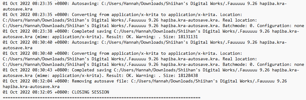 Manual saving gives lines like 01 Oct 2022 04:31:00 +0800: Saving Document C:\Users\Hannah\Downloads\Shiihan's Digital Works\Fauuuuu 9.26 hapiba.kra as C:\Users\Hannah\Downloads\Shiihan's Digital Works\Fauuuuu 9.26 hapiba.kra (mime: application/x-krita). 2048 * 2048 pixels, 17 layers. 101 frames, 24 framerate. Export configuration: No configuration