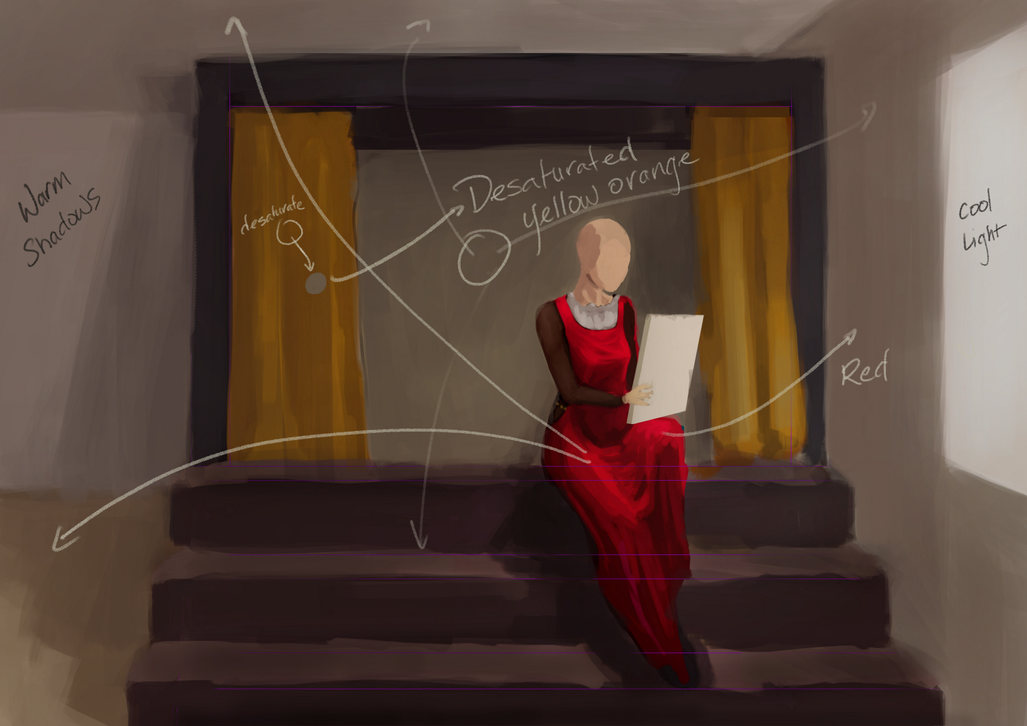 I wanted the frame around her (it’s actually a bed, just the bedding it’s visible, I guess I forgot to paint it in this attempt…) to be a very dark wood. Stairs - lighter wood, the floor - light wood, walls could be whatever. Curtains could be any color I want, and I’m not decided yet what should be the background of her - I guess it should be fabric from the other side of the bed (second pair of curtains, just closed). Light should come from the right side and the right side is a wall that is perpendicular to the stairs and the bed and it touches it (as in, if that woman reached her arm, she would touch the wall). There is a window on the right side just outside of the canvas. (You see, I have all of it thought out, I just can’t figure out how to make colors match what I imagined…). I want colors to be dim and not overpower the beautiful richness of red of the dress.