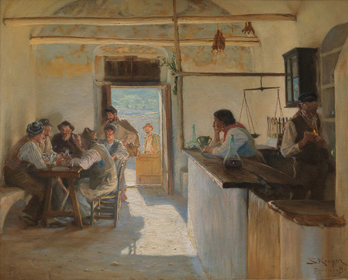 In the white fabrics especially you can see how much of the surrounding colours they pick up (note the variation in warm an cool patches!), and the first painting lets the browns of the floor and wall go very cool in the shadows. The tavern has a nice demonstration of what a bright sunlit patch can do to a room.