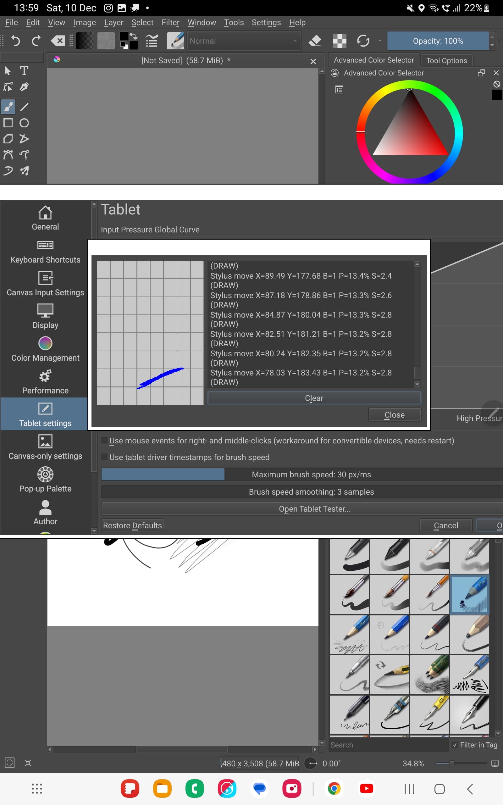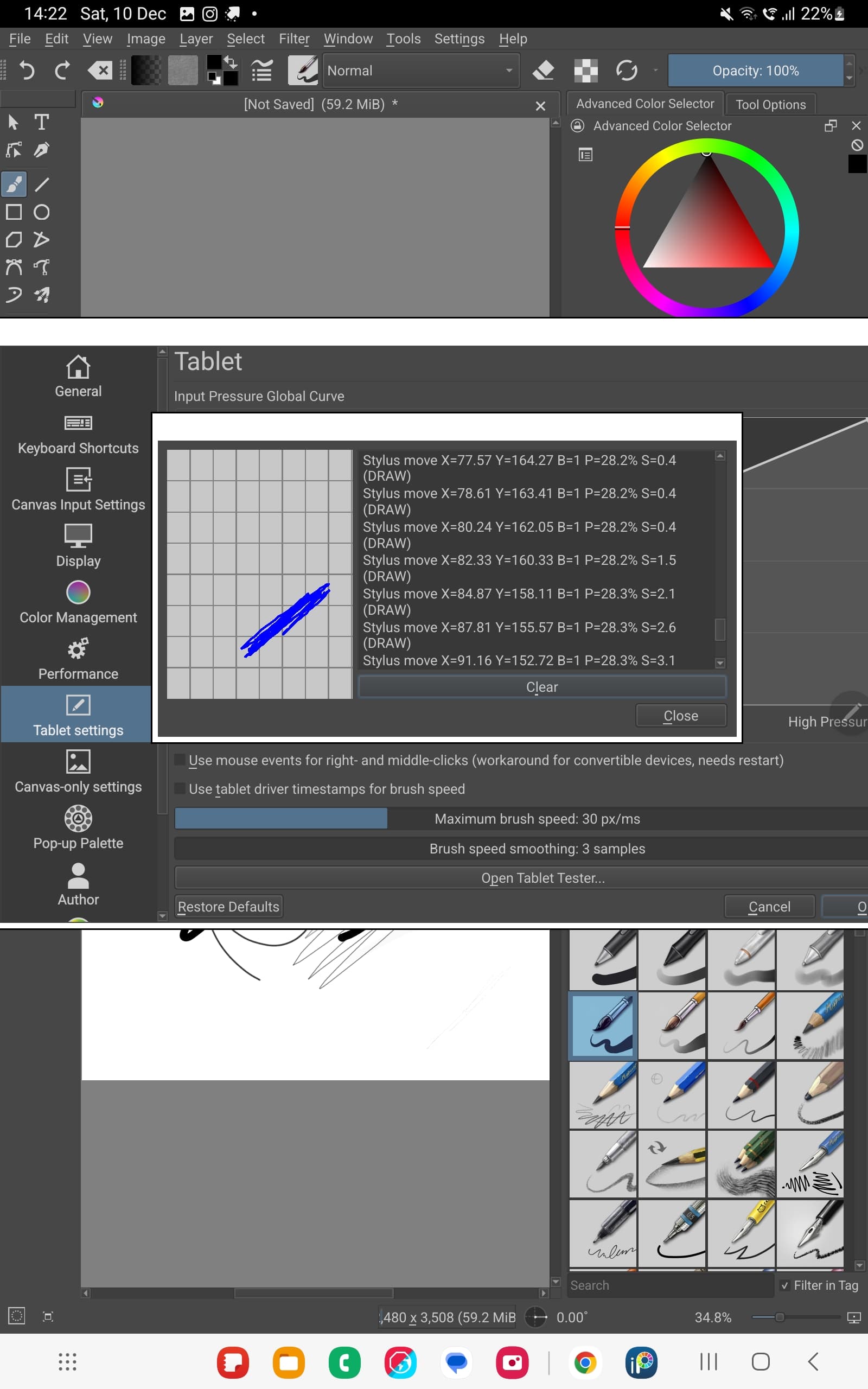 If go Setting > Configure Krita > Tablet settings > Open Tablet Tester and draw in the test area with Spen, what does it says?