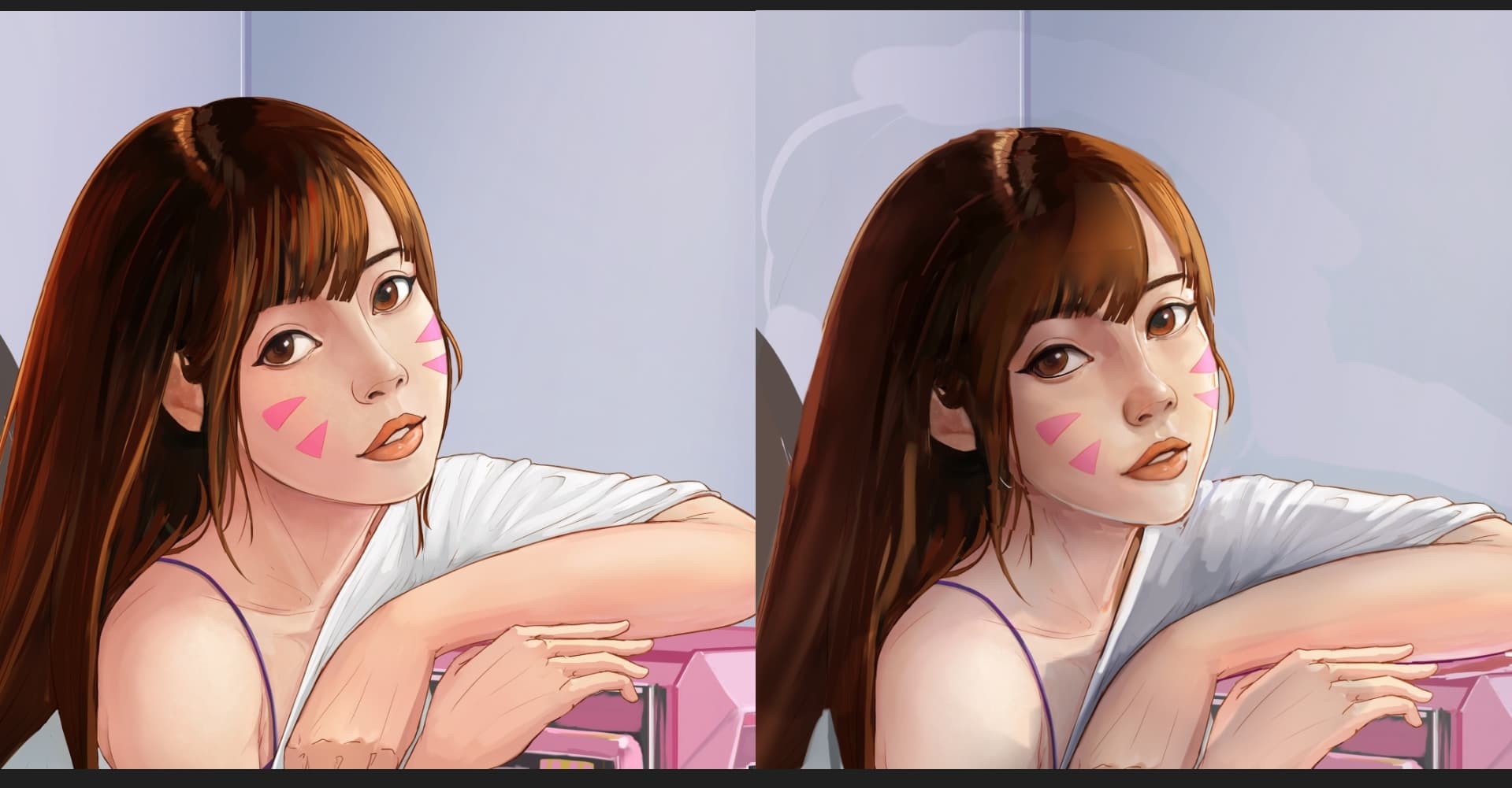 Thank you, I did bring both into a more familiar perspective. D.va has her head rotation changed and with Vi, I made the decision to change the perspective after the first cut to the chin.