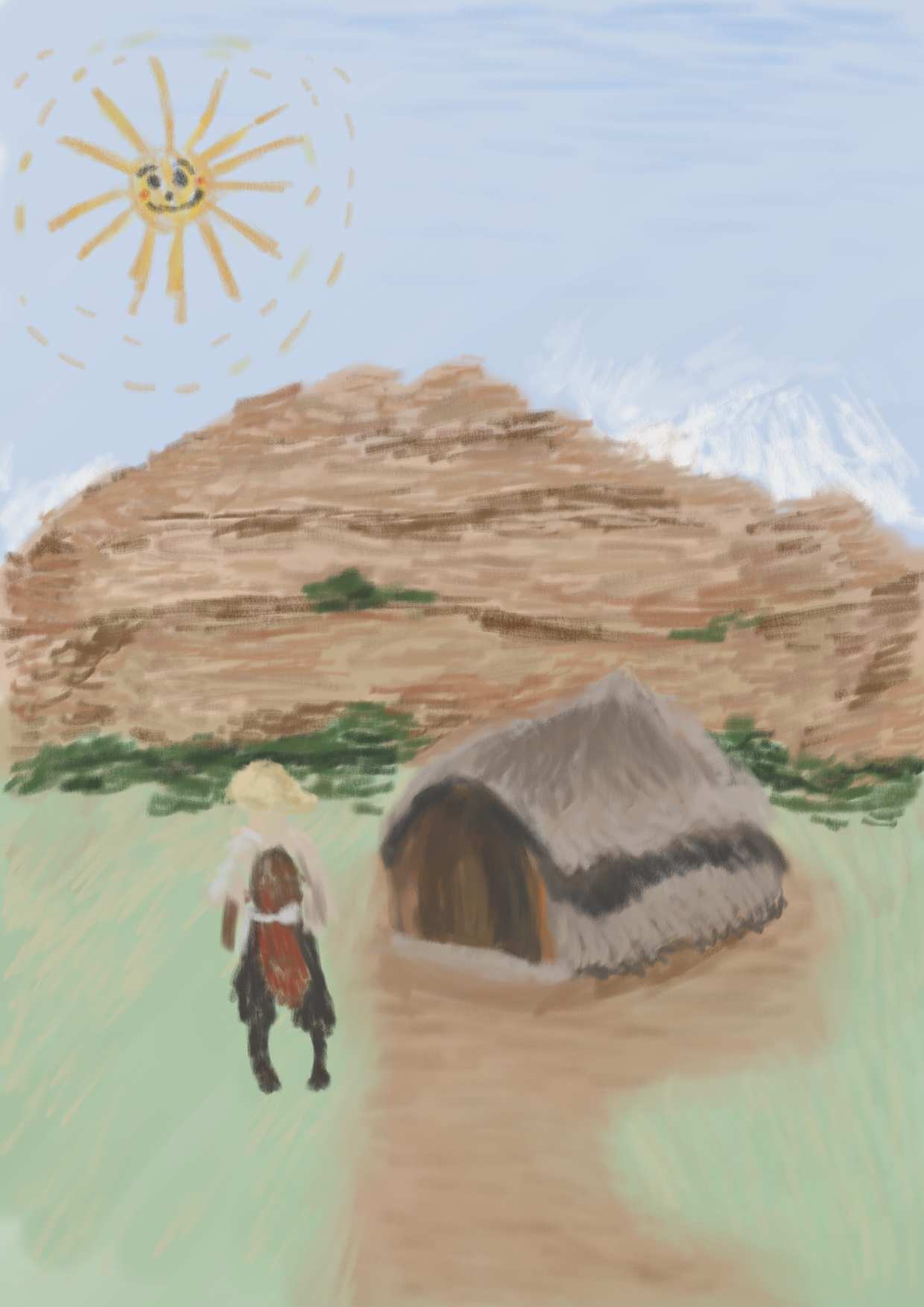 Inspired by the sun embroidery thing, I tried to go for a sort of embroidery style, like a stitched wall-hanging sort of thing. The rocks are kind of shapeless but I still like the effect. The person might be a giant compared to the building.