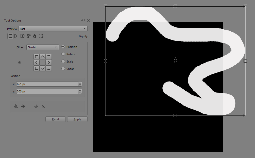 But becarefull; deforming the edge of your selection can leave artifacts. The default mode “Instant Preview” is really slow because it recompute all the layer stack and you also work on a full preview of the pixels. This mode is really not adapted in my opinion to the Liquify tool. A bug report explains it a bit more : 423788 – Liquify Tool - Utterly Slow Performance .