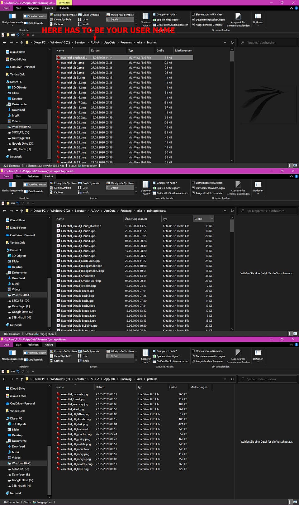 Normally it is sufficient to move the files contained in the subfolder “essential” in the folder “brushes” directly into the folder “brushes” to be able to use this brushpack again. So just move these files with your file manager (Explorer, Dolphin, MidnightCommander et cetera) one level up and then start Krita.