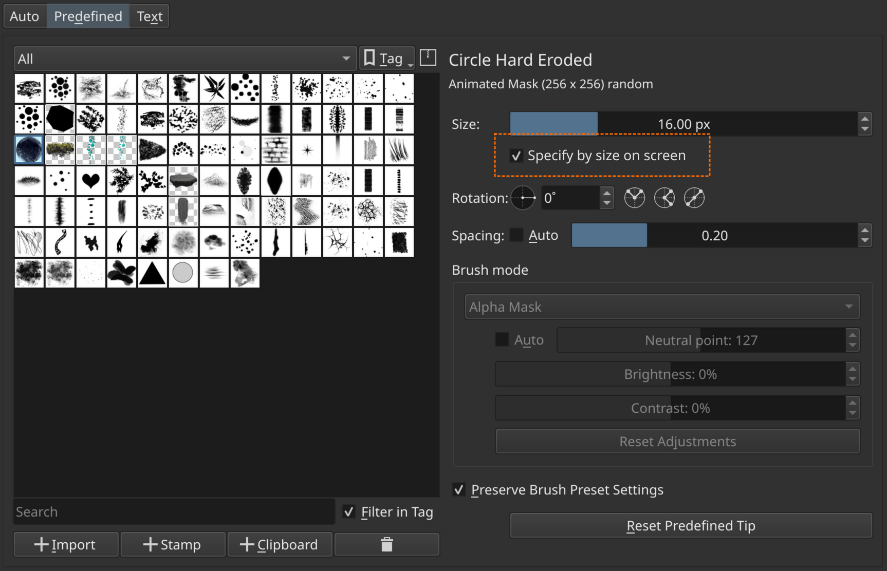 I propose an option in the “Brush Editor / Brush Tip” that allows a brush to stay fixed to screen size (not affected by zooming) as opposed to canvas size (current behaviour).