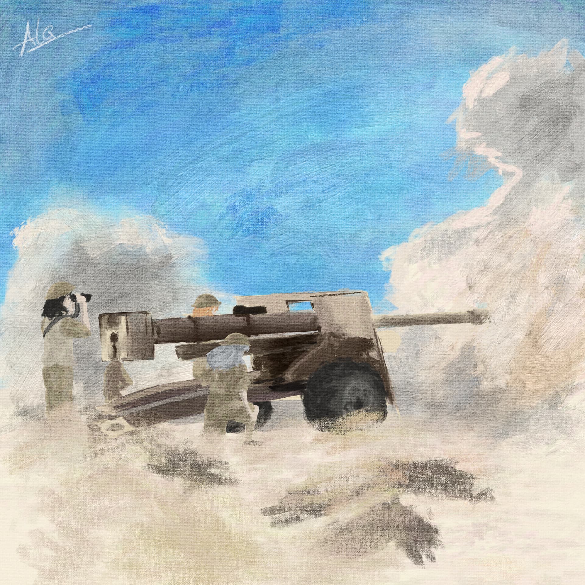 First time post here, anyway, this is a painting of a QF 17-pounder anti-tank gun, operating in the North African campaign of World War 2, with a bit of anime in it~.
