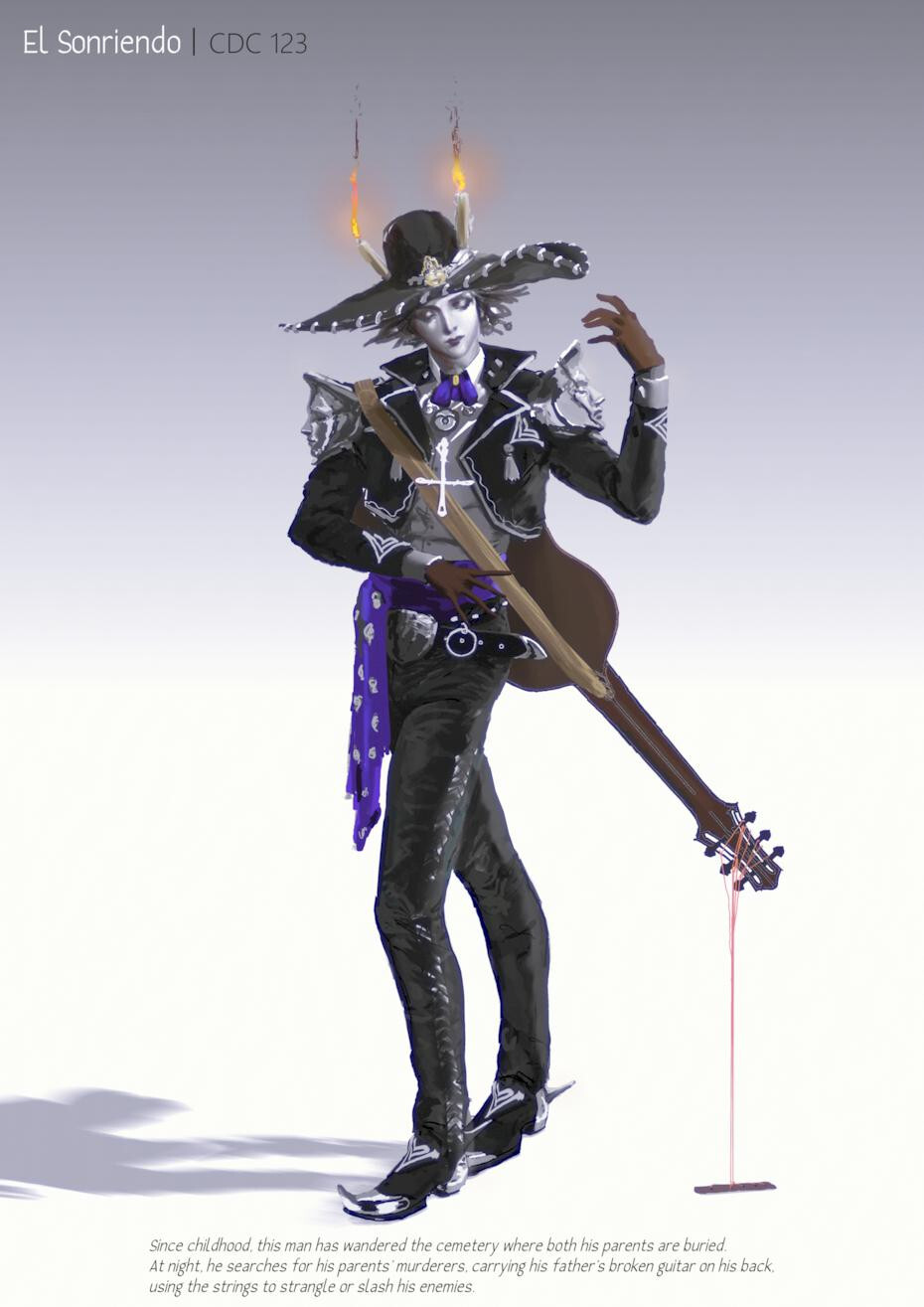 At night, he searches for his parents’ murderers, carrying his father’s broken guitar on his back,