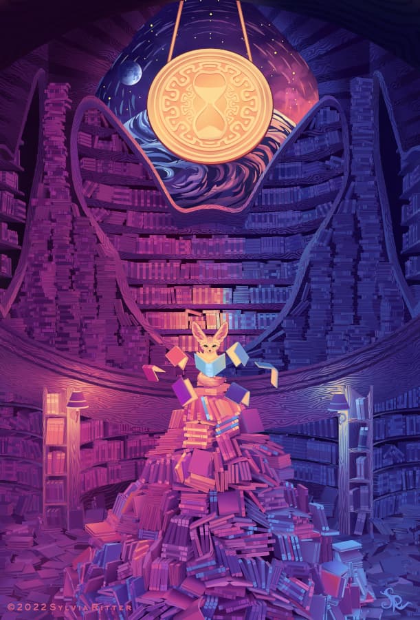 Hi there, @underbutler & @slightlyangrydodo I placed the light in Blender. You can play around until you are happy with the result. The books and items are all hand-placed, no simulations or other methods were used to speed up the process I roughly sculpted a fox head, too. Color and details were added with Krita. It took about a month to finish the artwork.