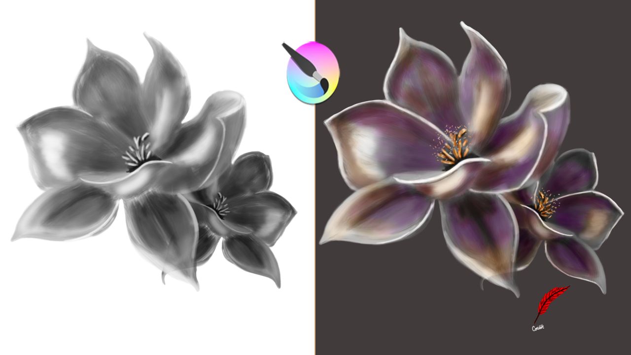 I drew (using the pencil and bristles_hairy brushes set at different sizes, opacity, and flow) two flowers in black and white.