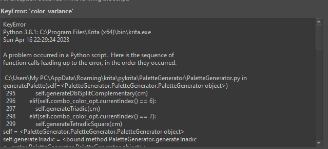 File “C:\Users\My PC\AppData\Roaming\krita\pykrita\PaletteGenerator\PaletteGenerator.py”, line 287, in generatePalette