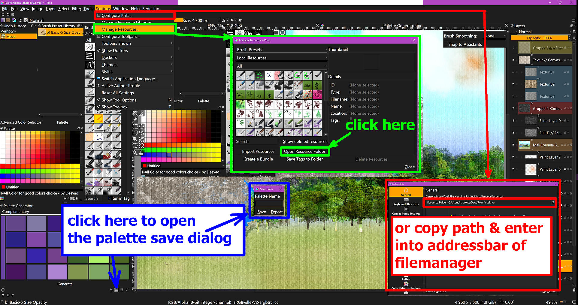 Another way would be the red one. There you go via âSettingsâ and the first entry "Configure Krita⌠", this opens the main configuration dialog of Krita, where you select âGeneralâ on the left and select the last tab âResourcesâ in the general settings, in this dialog you will only find the path to your resource folder, if you copy this path into the address bar of your file manager and confirm, then the file manager switches to the resource folder of Krita, where you open the subfolder âpalettesâ, in which you will find your self-created palettes and the default palettes of Krita.