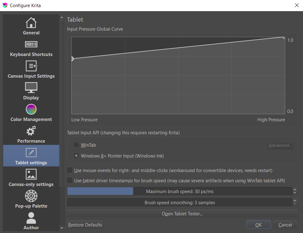 I’ve tried to restart the program, restart my computer, update Krita, and none of those have helped. I checked to make sure the pen was still functioning normally in other programs (like OneNote, Microsoft Word), it still seems to. I tried to map a secondary button to erase, which then worked in other programs but not Krita (even after switching on “Use Mouse Events for Right- and Middle-clicks”). “Temporarily Save Tweaks to Presets” is on, tried to toggle it, nothing happened. I tried switching to Wintab for the Tablet Input API - that made the pen non-functional. Not sure what I’m doing wrong. Any help is appreciated!
