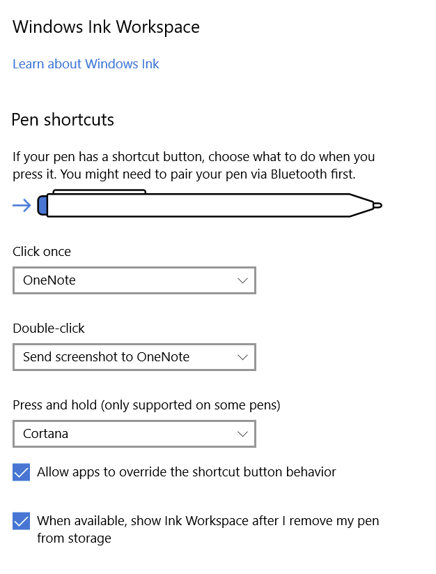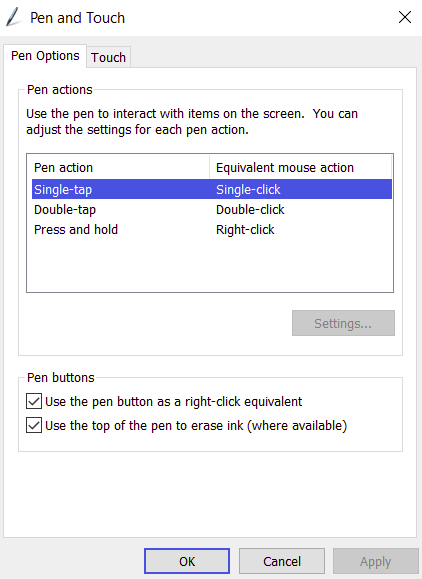 Further, if you have such a button, the Pen and Touch options can be used to enable using the top of the pen to erase ink.