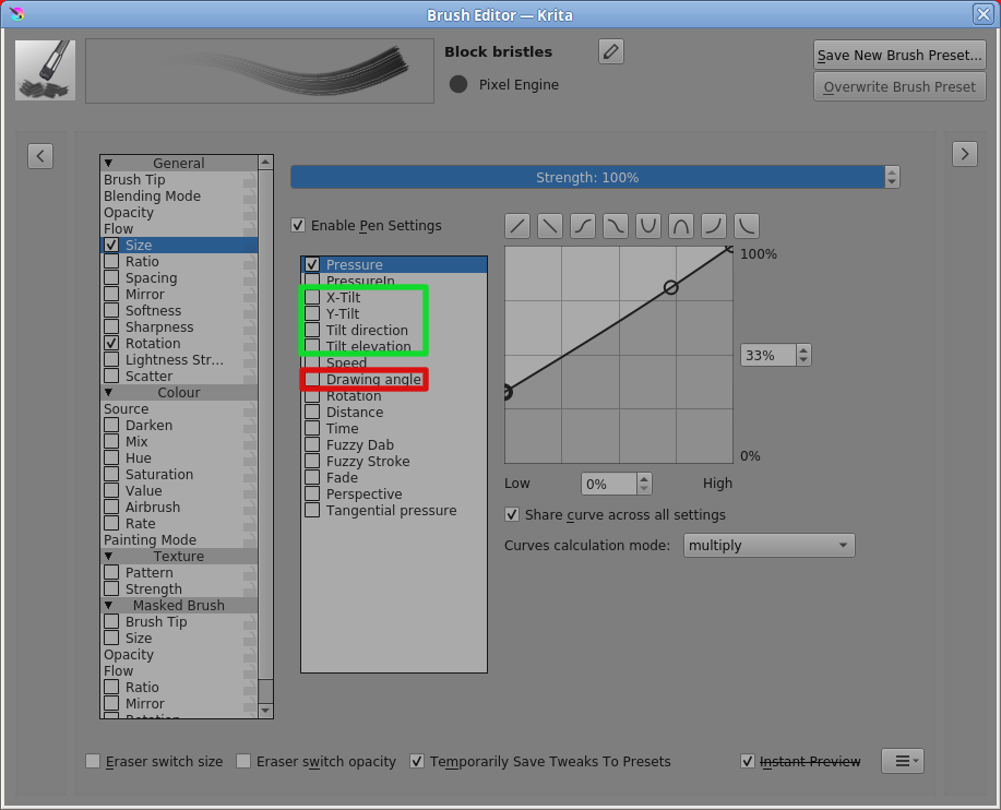 Basically I want to be able to change brush size by twisting the pen as if it were a chisel tip, but Krita doesn’t tell the difference between me rotating the pen or drawing at a different angle, and I can’t figure out how to correct it.