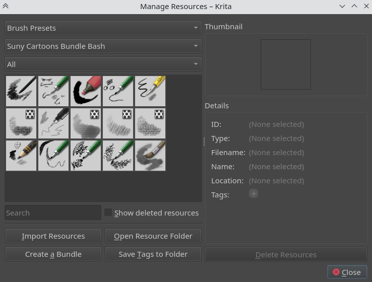 I’m not sure why this is happening since I’ve had no issues importing my own brushes, and according to this friend he hasn’t had issues importing other bundles. Is there something I forgot to do when making a bundle? There aren’t a lot of up-to-date tutorials on creating bundles in Krita so it’s possible that there’s something I was suppose to do but didn’t.