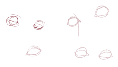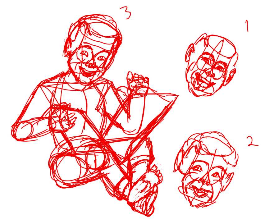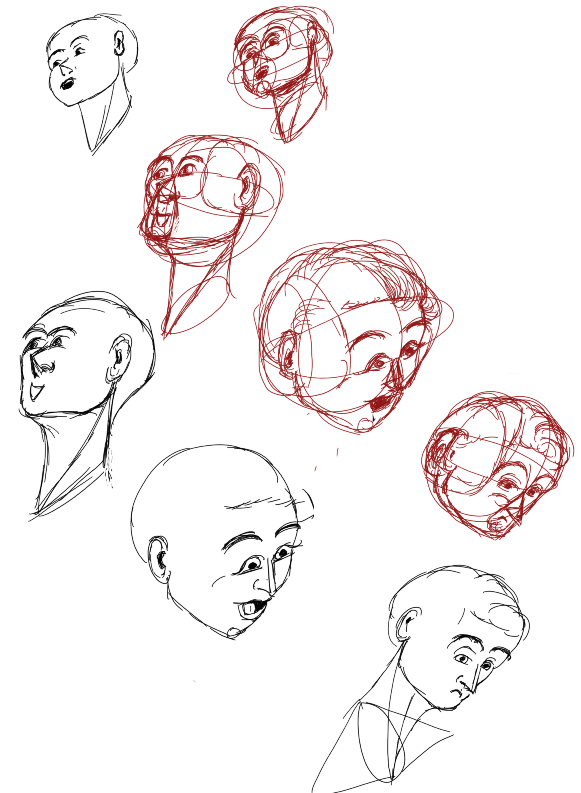 In general, on that first run, I personally think I overdid it with the hatching/shading. It works-ish, but I was aiming for a simpler look. And for some reason I decided to sketch each one with a different colored brush (which makes that one ¾ angled curly mop look like seaweed or something!