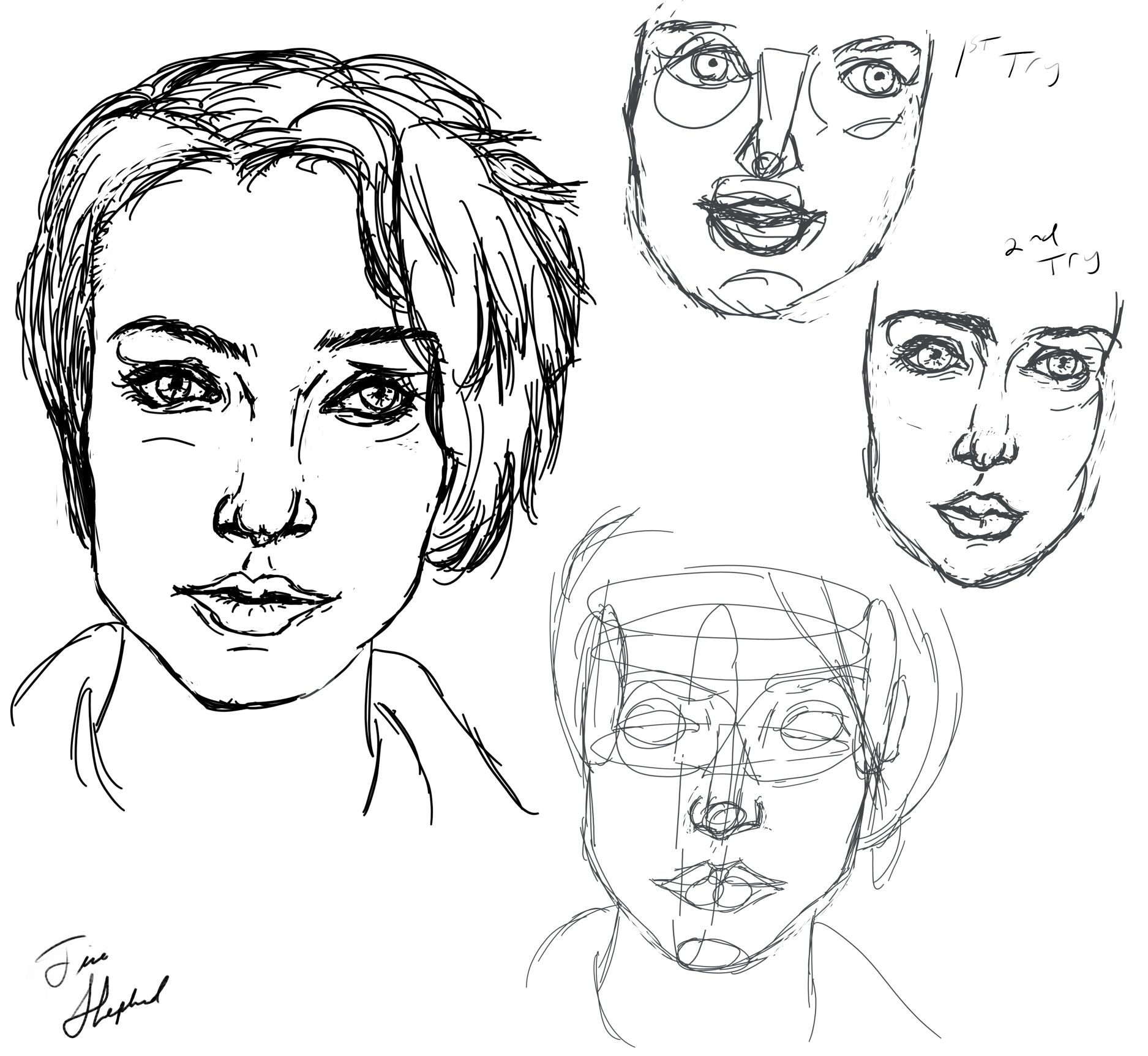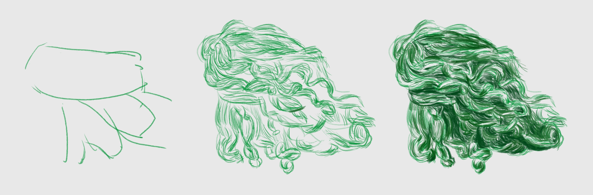 The WIPs for the hair are such because the teacher at Paintable suggested the method of segregating the respective clumps and draw directional arrows for the flow of each one. (For someone who generally sketches hair like it’s a bowl of noodles